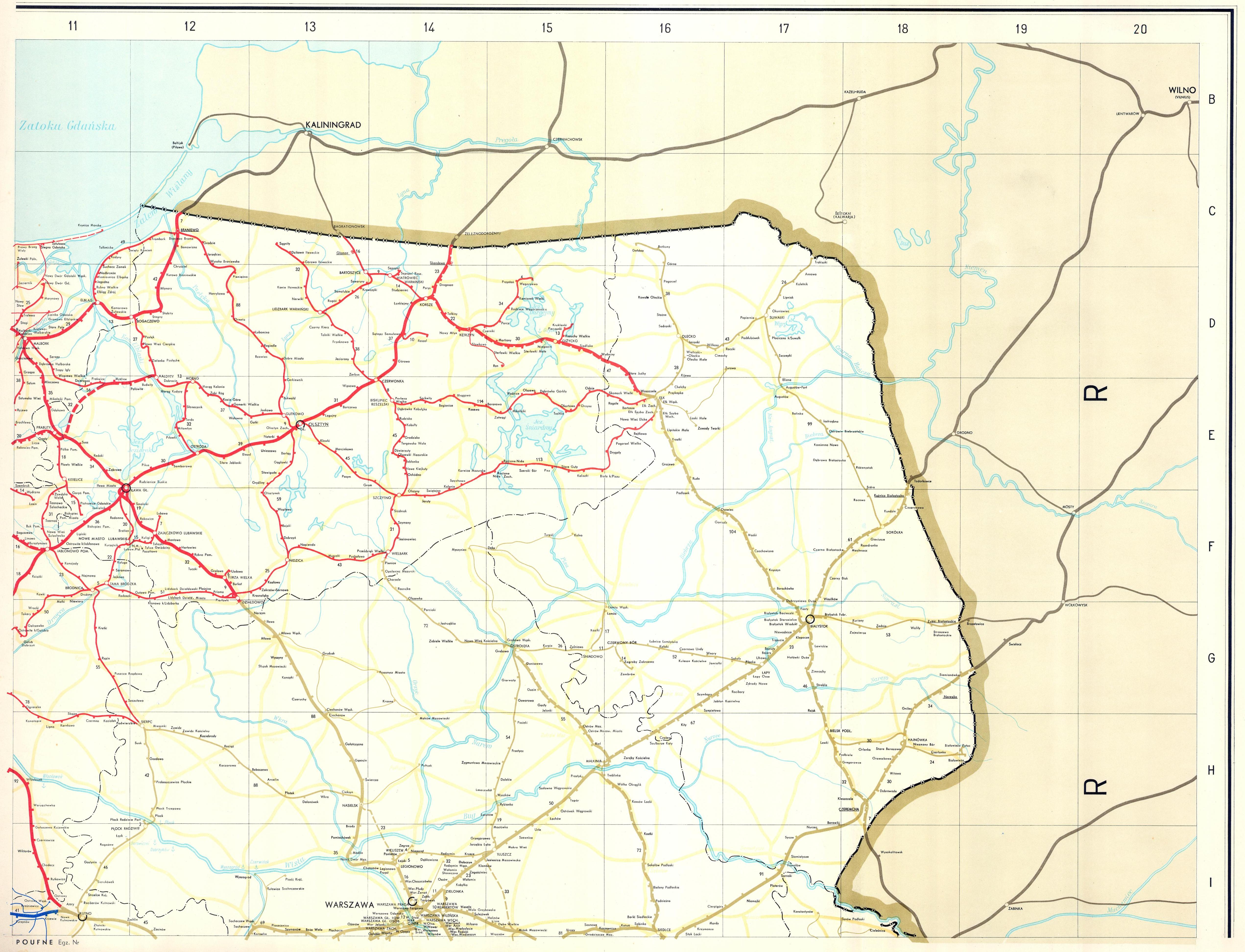 Mapa sieci kolejowej w Polsce, część północno-wschodnia