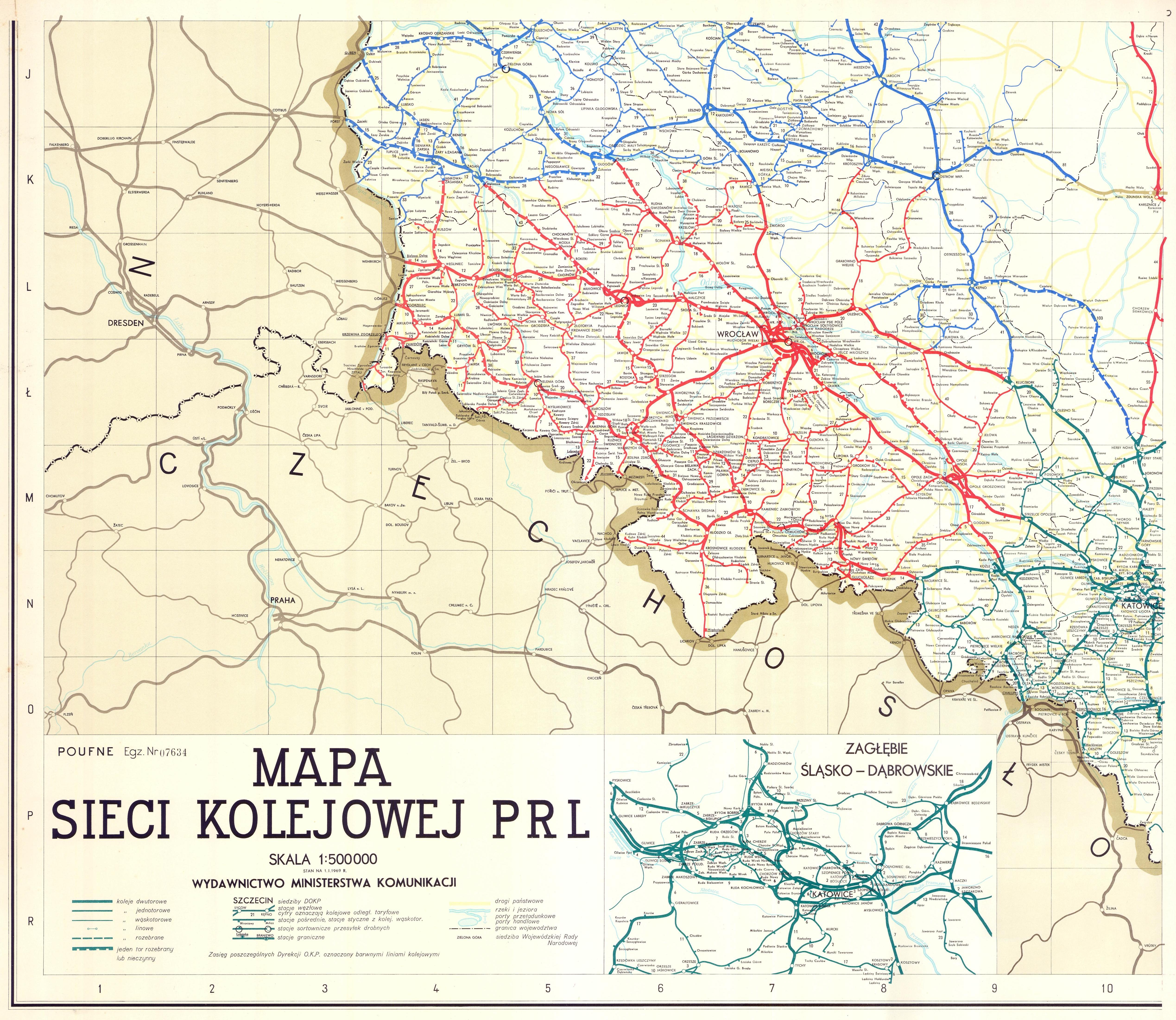 Mapa sieci kolejowej w Polsce, część południowo-zachodnia