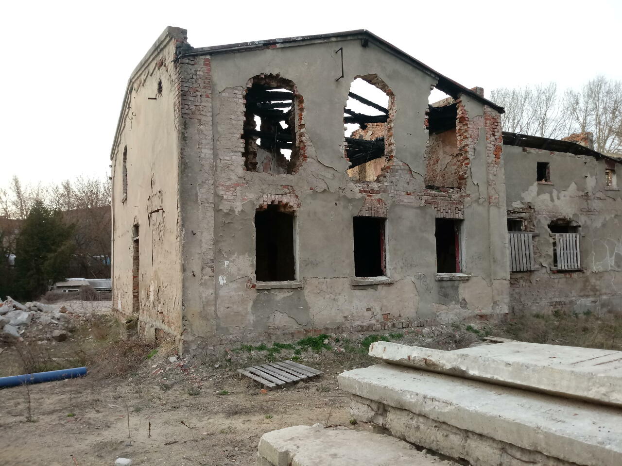 Niezutylizowany świadek dawnej zabudowy terenu obok młyna Nadolnik. Widok od strony starotorza bocznicy, lewy brzeg rzeki Głównej w Poznaniu. W prawo ul. Bałtycka, w lewo d. młyn.