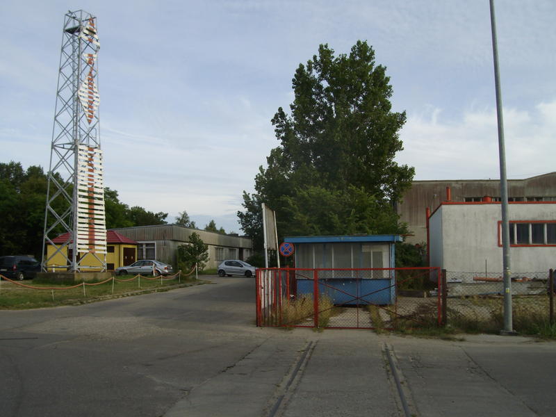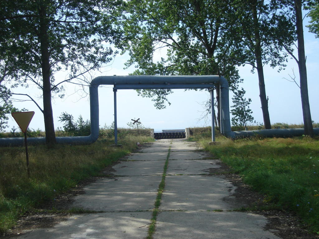 Nieczynny przejazd kolejowy na terenie Wojskowego Portu Wojennego w Helu (do niedawna teren niedostępny do zwiedzania, obecnie można wejść na teren portu, który jest wystawiony na sprzedaż). Za przejazdem widoczna brama wjazdowa na teren portu.