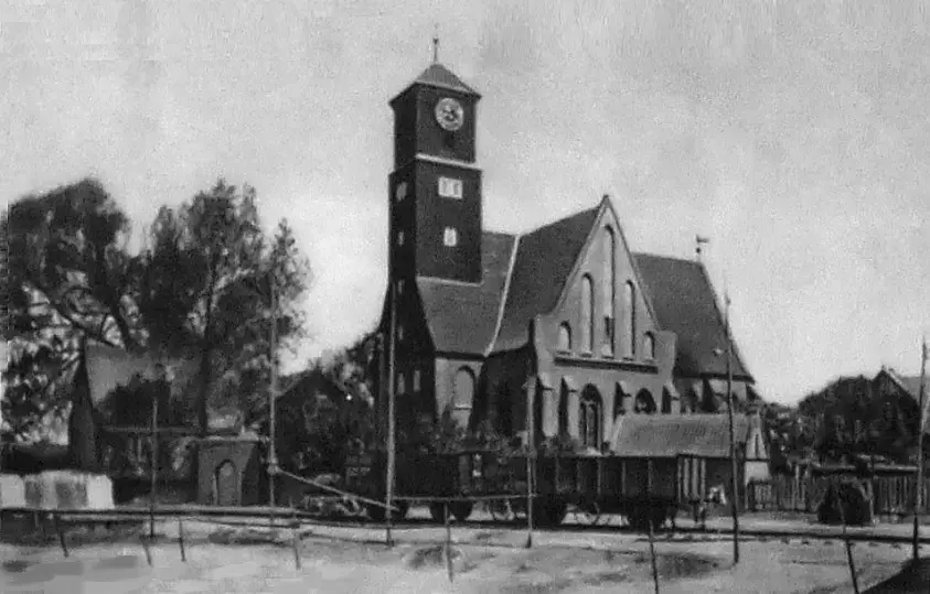 Datowanie zdjęcia można ocenić po widocznej wieży kościelnej. Pochodzącą z końca lat 80-tych XIX w. drewnianą, ażurową wieżę, wybudowaną w stylu neogotyckim (starszą wieżę rozebrano w 1863, po kolejnym sztormie) i umieszczoną na styku korpusu z prezbiterium, po roku 1926 rozebrano i przeniesiono bezpośrednio nad kruchtę (wejście do kościoła). W trakcie prac wieżę oszalowano deskami - jak na fotografii. Wieża w takiej formie przetrwała do września 1939, kiedy została rozebrana, aby utrudnić artylerii niemieckiej ostrzał miasta (stanowiła dobry punkt odniesienia, widziany z daleka).