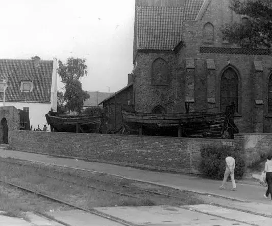Tor bocznicy do portu rybackiego na tle kościoła św.św. Piotra i Pawła (od 1526 do 1945 ewangelicki), obecnie Muzeum Rybołówstwa. Fotografia przedwojenna wykonana po roku 1926. Prawdopodobnie z lat 30-tych XX w.