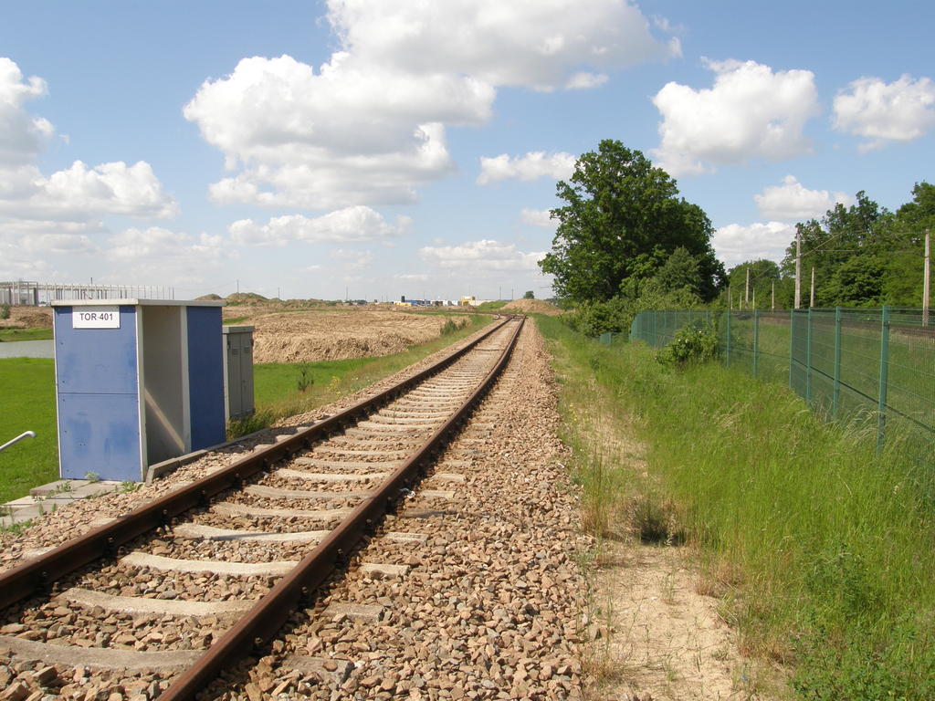 Centrum Dystrybucji Ikea. W oddali pierwsza z kilku zwrotnic. Po prawej linia Koluszki - Piotrków Trybunalski. Widok w kierunku Koluszek. 140,5 km.