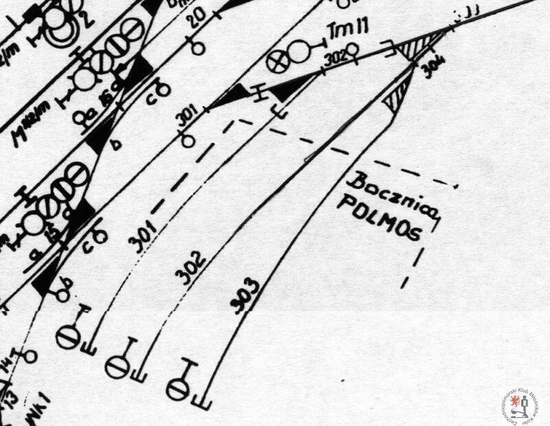 Plan schematyczny bocznicy. Bocznica posiada dwa tory nr 502 i 503. Obecnie bocznica jest odcięta od sieci PKP. Zlikwidowane zostały tory 500 i 501.