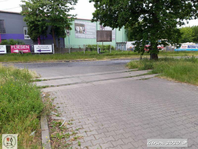 Zaasfaltowany przejazd na ul. Santockiej toru prowadzącego do bocznicy jednostki wojskowej, a w przeszłości również do bocznic Samopomocy Chłopskiej, CPN i W.P.B.