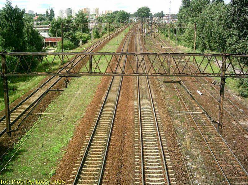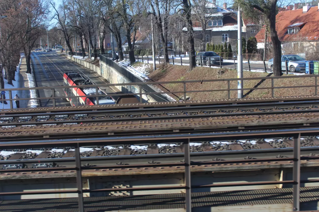 Górna część wiaduktu na ulicy Pomorskiej w Gdańsku. Widoczne tory dla pociągów dalekobieżnych. W lewą stronę Gdańsk Zaspa, w prawą Sopot/Gdynia.