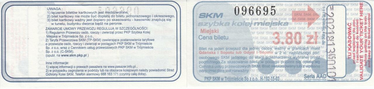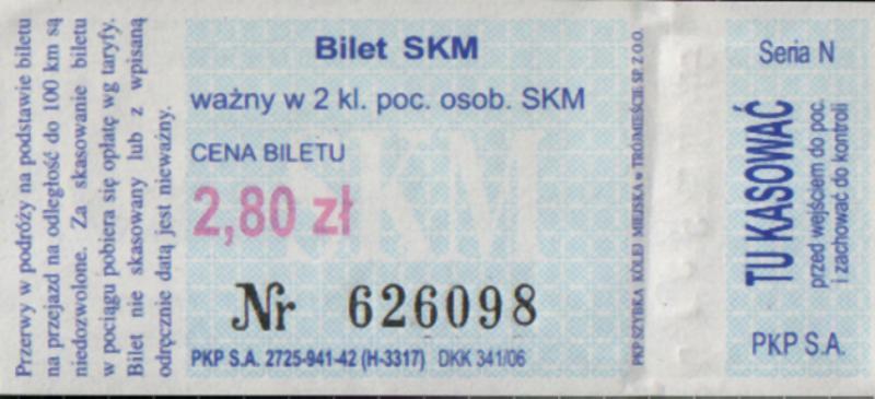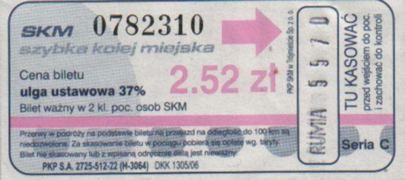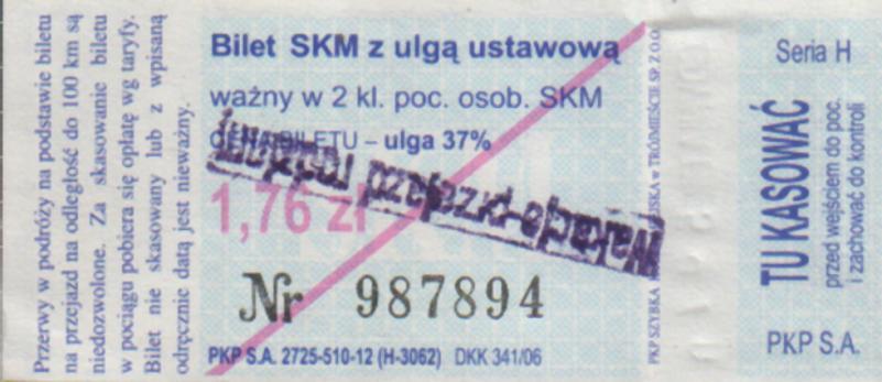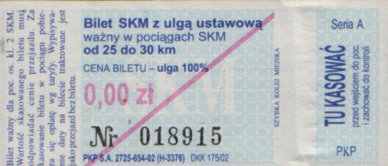 Bilet na SKM z ustawową ulgą 100% o nominale 0.00 zł.