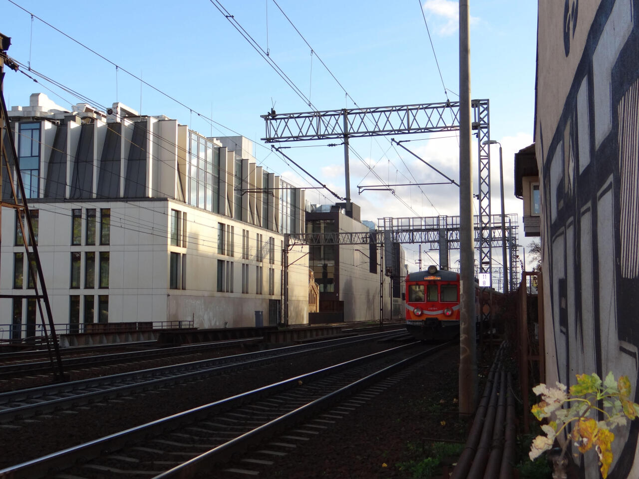 Fragment ściśle obudowanego szlaku kolejowego łączącego Gdynię, Sopot i Gdańsk. Na zdjęciu widzimy (u dołu) tory kolejowe podchodzące pod stację w Sopocie, gdzie dojeżdża widoczny w tle pociąg. Dalsze torowiska służą SKM. Widok w kierunku Sopotu i Gdańska.