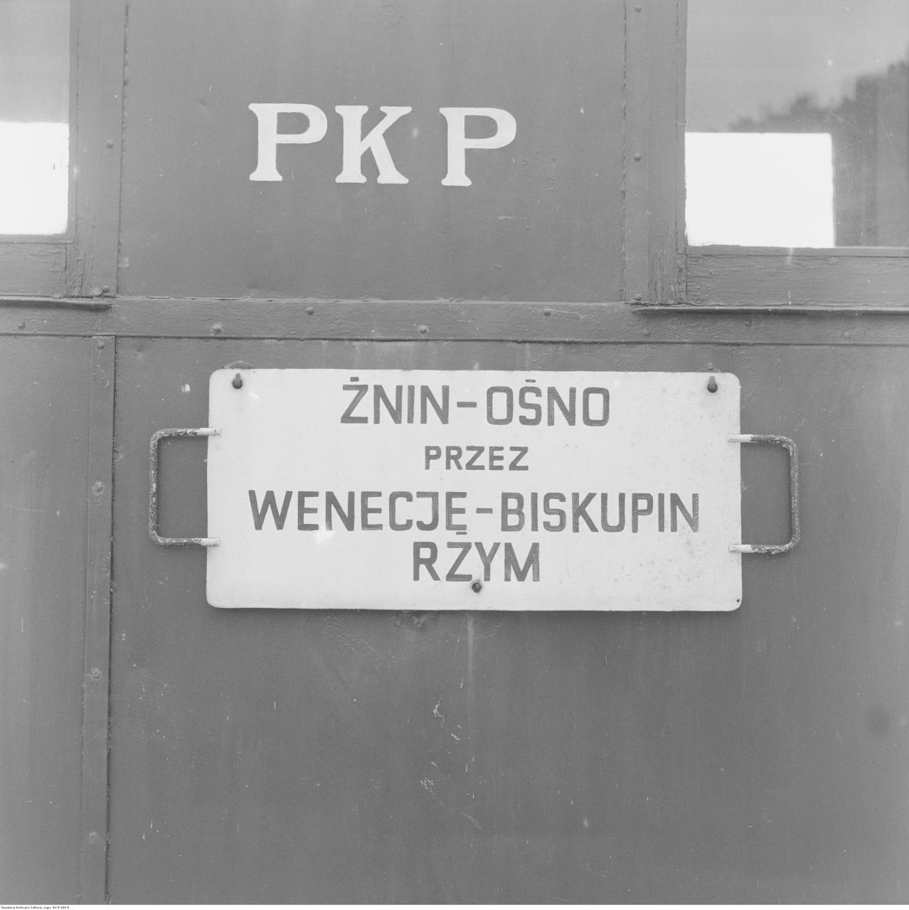 "Napis na wagonie dotyczący połączenia kolejowego Żnin - Ośno przez Wenecję, Biskupin, Rzym".