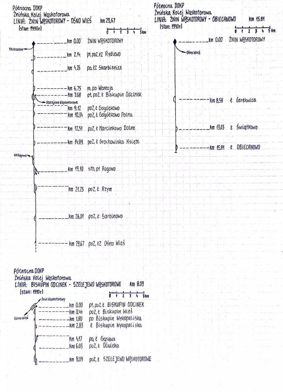 Schematy linii kolejowych: Żnin Wąskotorowy - Ośno Wieś, Biskupin Odcinek - Szelejewo Wąskotorowe, Żnin Wąskotorowy - Obiecanowo. Stan - 1990 rok.