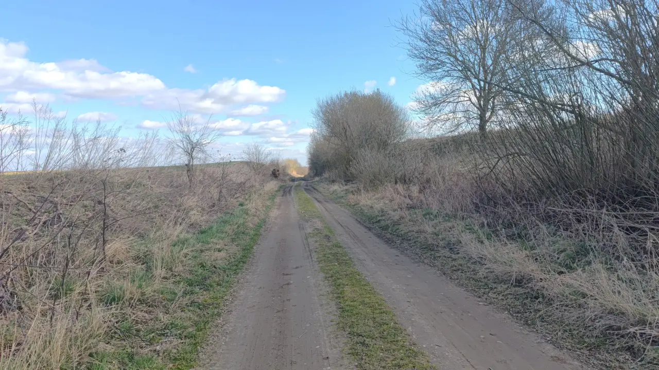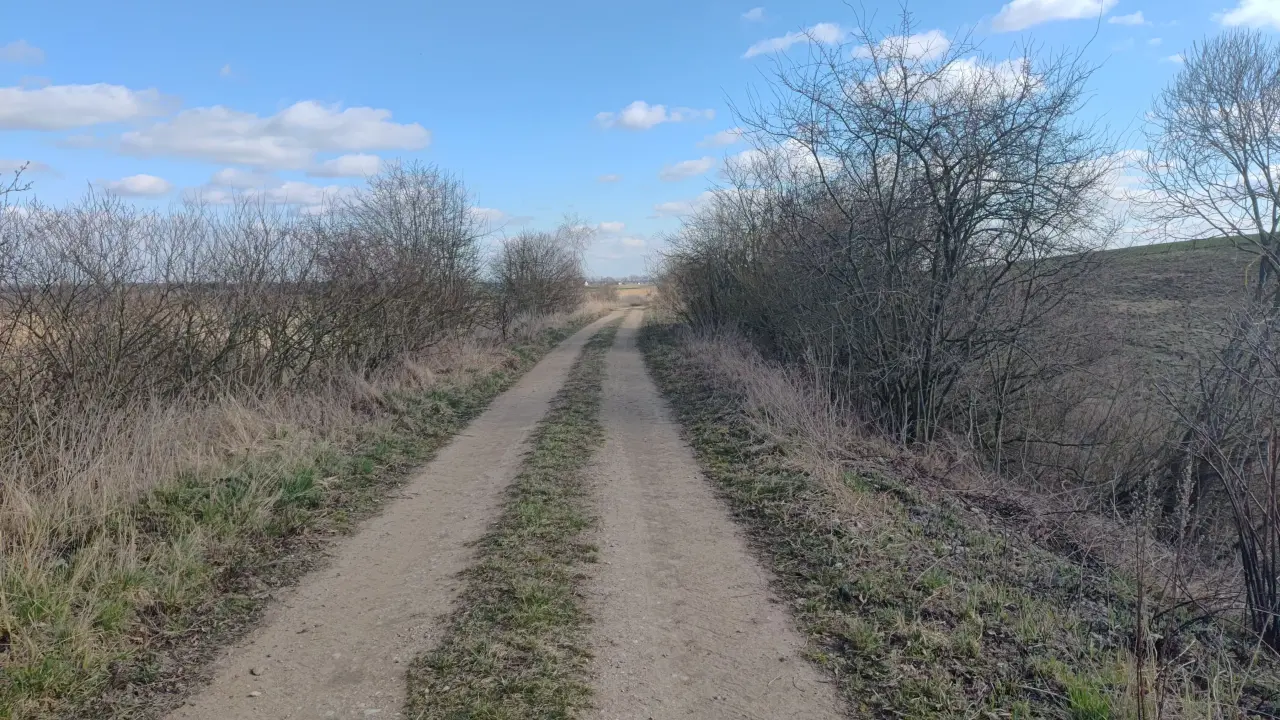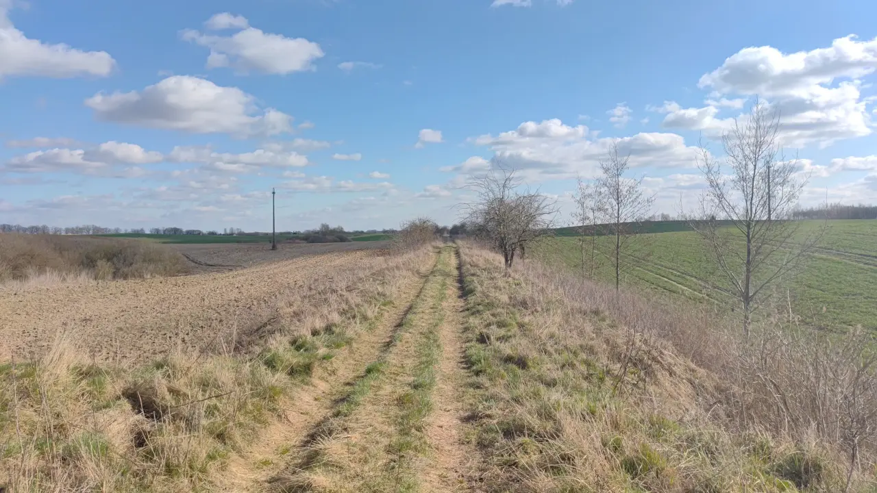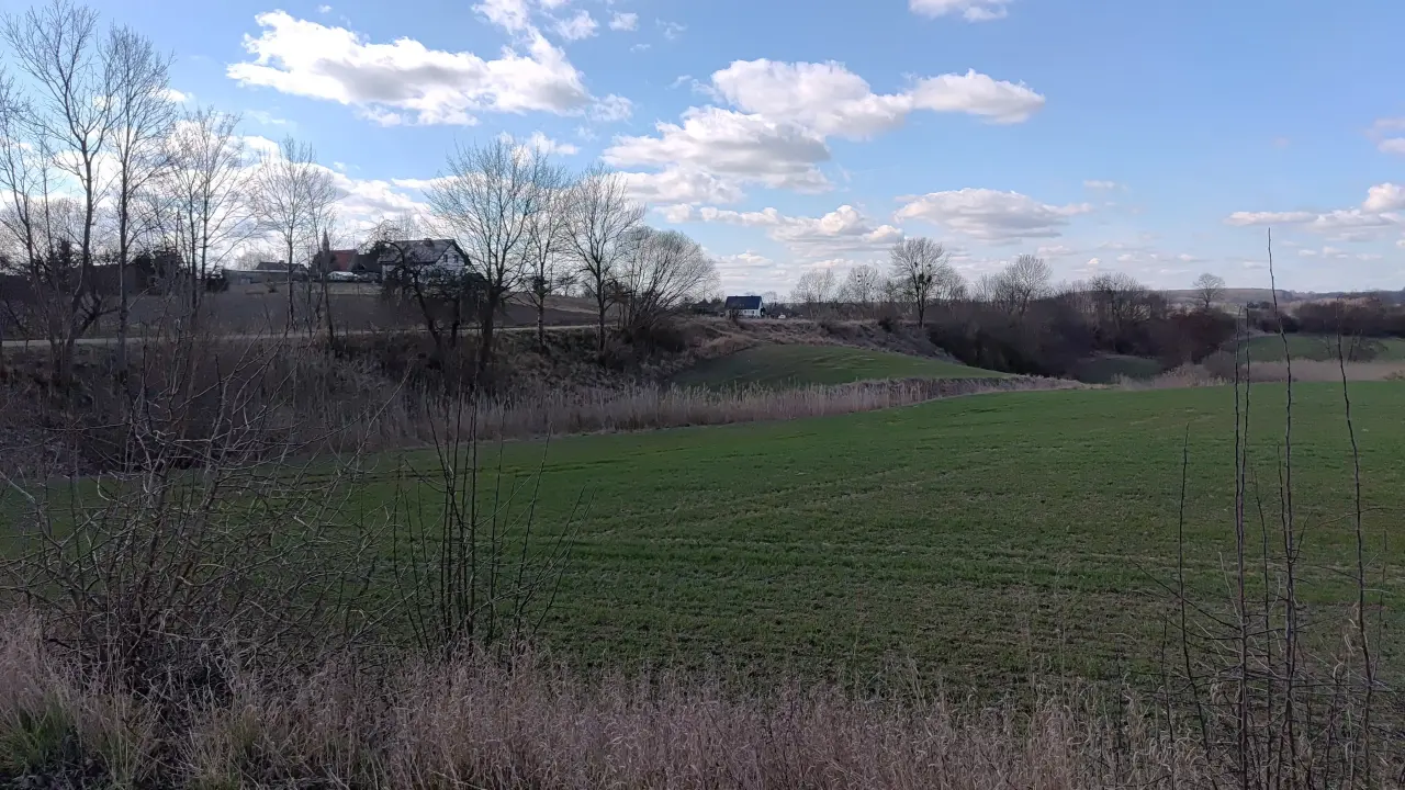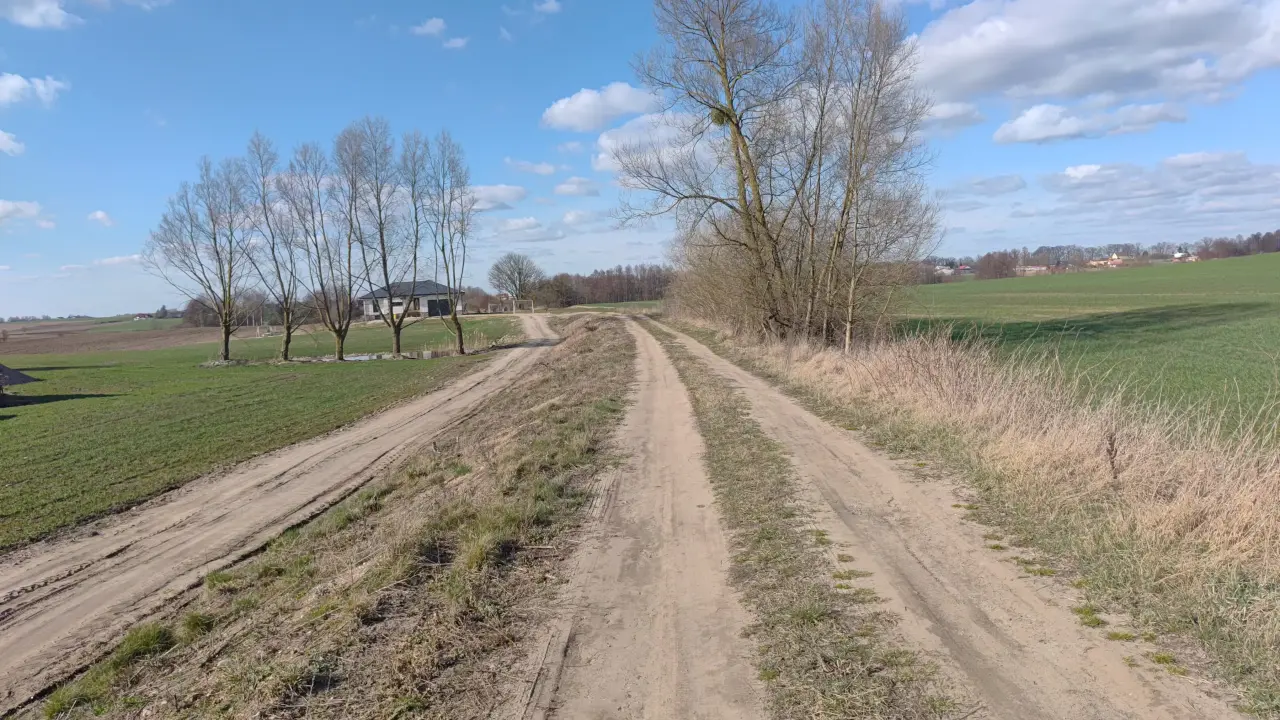 Zaraz za nasypem z przepustem, kończy się wygodna ścieżka, zaczyna się natomiast trochę mniej uczęszczana dróżka, po dawnym starotorzu. Widok w kierunku Biskupca Pomorskiego Miasto.