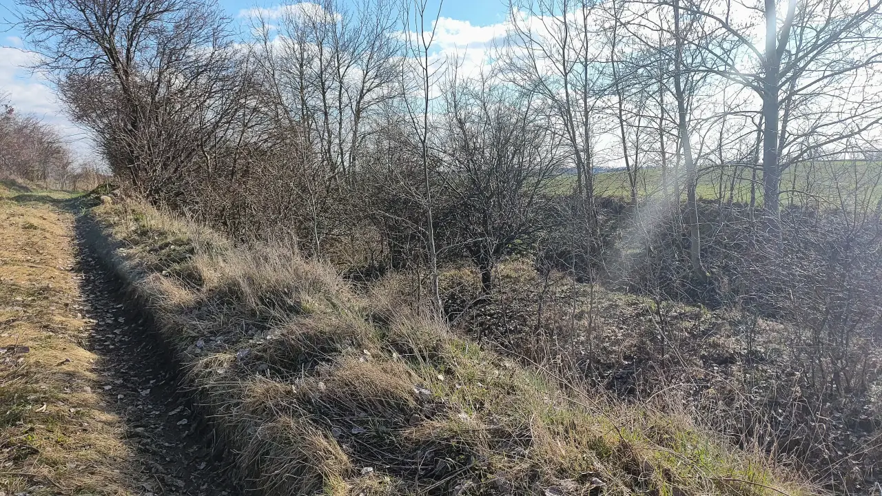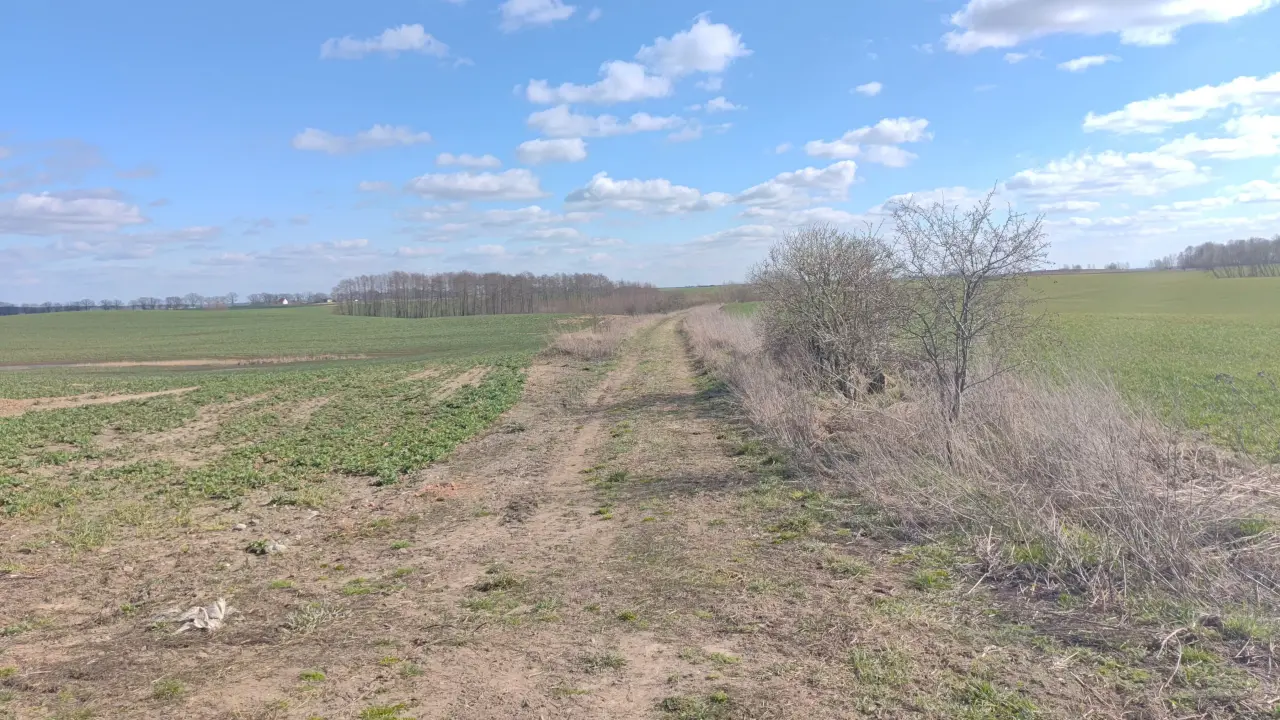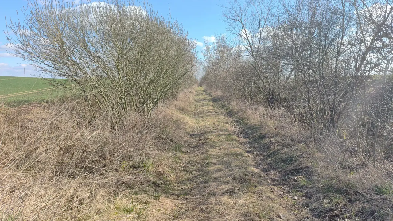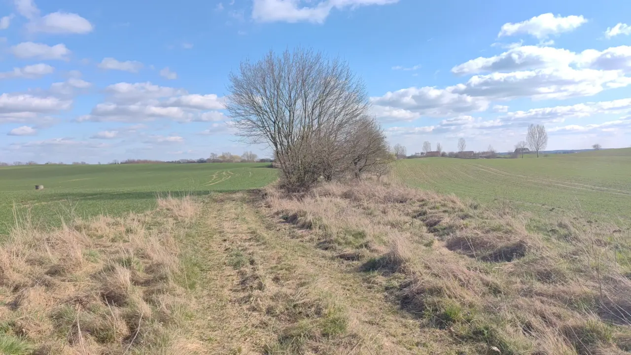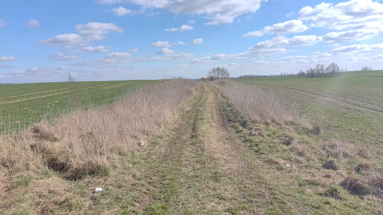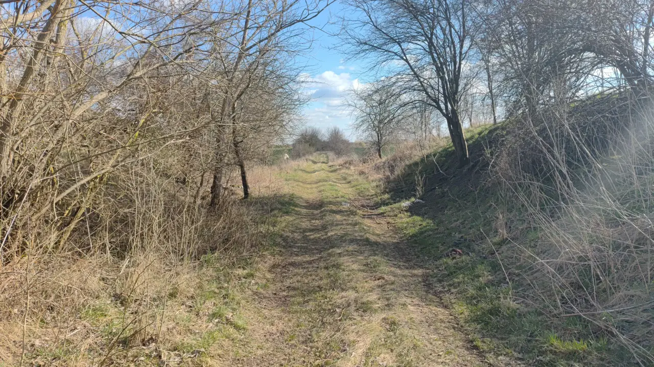 Zaraz za nasypem z przepustem, kończy się wygodna ścieżka, zaczyna się natomiast trochę mniej uczęszczana dróżka, po dawnym starotorzu. Widok w kierunku Biskupca Pomorskiego Miasto.