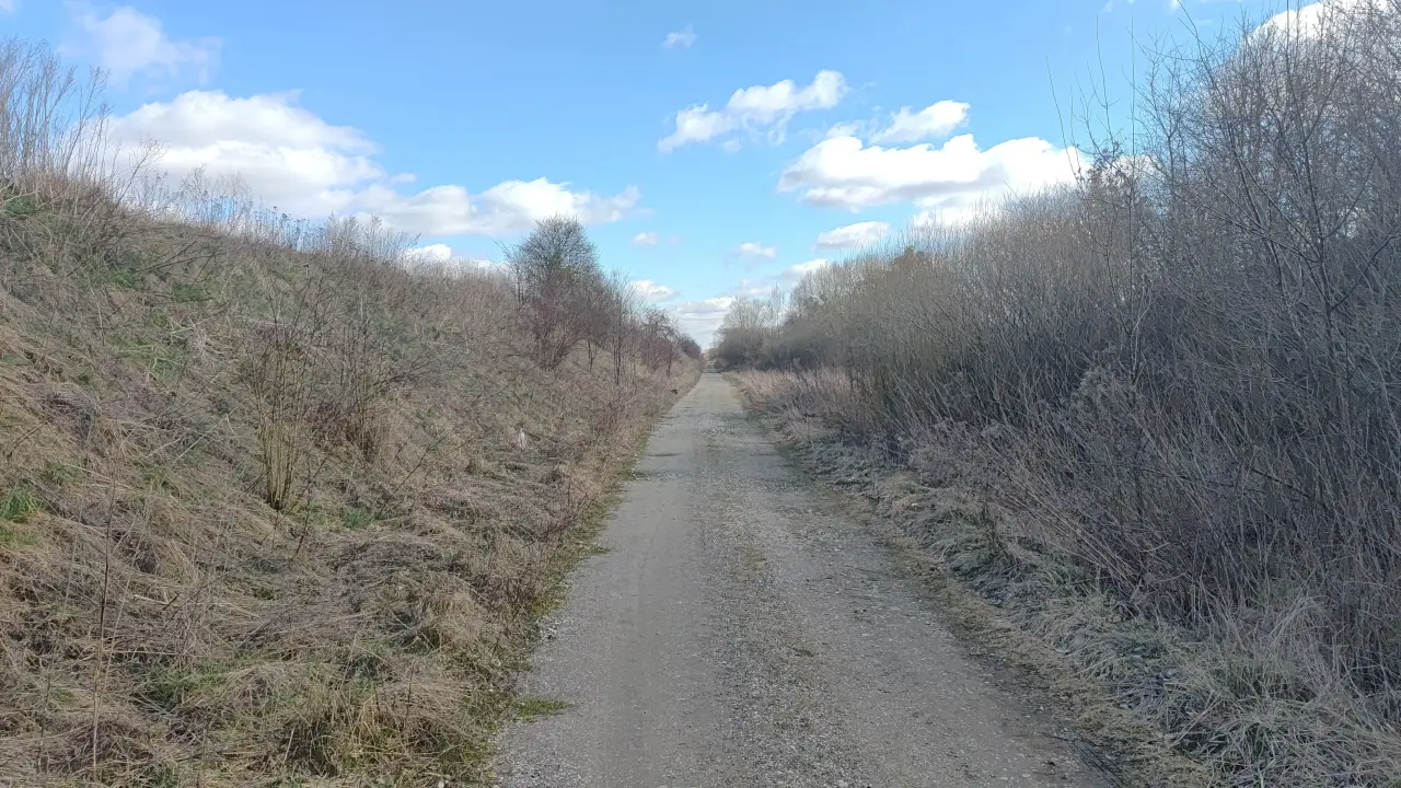 Widoczna ścieżka na pierwszym planie to starotorze, (niestety zdjęcia przyczółków mostu na Młynówce nie posiadam, ze względu na psy puszczone w samopas, które krótko po wykonaniu tego zdjęcia zaatakowały mnie.) Widok w kierunku na Kisielice.
