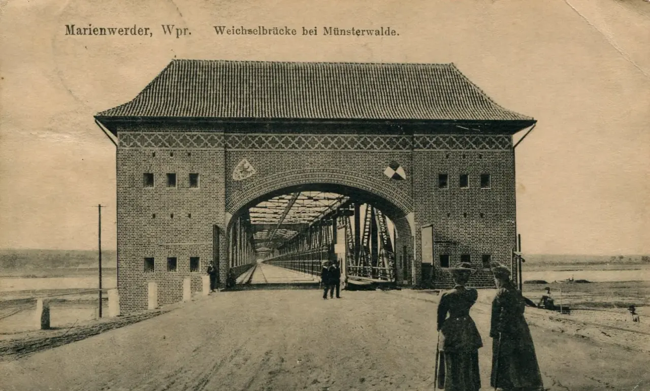 Dwa zabytkowe wiadukty kolejowe. Na pierwszym planie widzimy wiadukt na linii Gdańsk - Warszawa, zaś drugi to wiadukt na linii Prabuty - Kwidzyn.