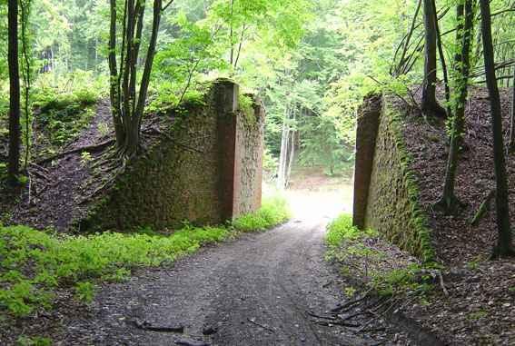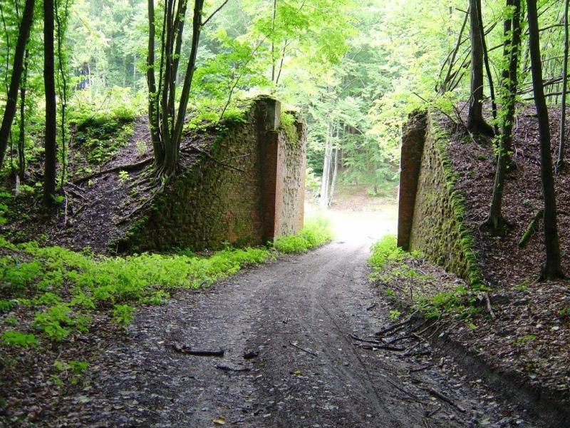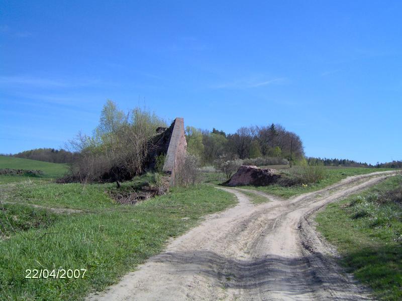 Ruiny wiaduktu w lesie na północ od wsi Kwietniewo.