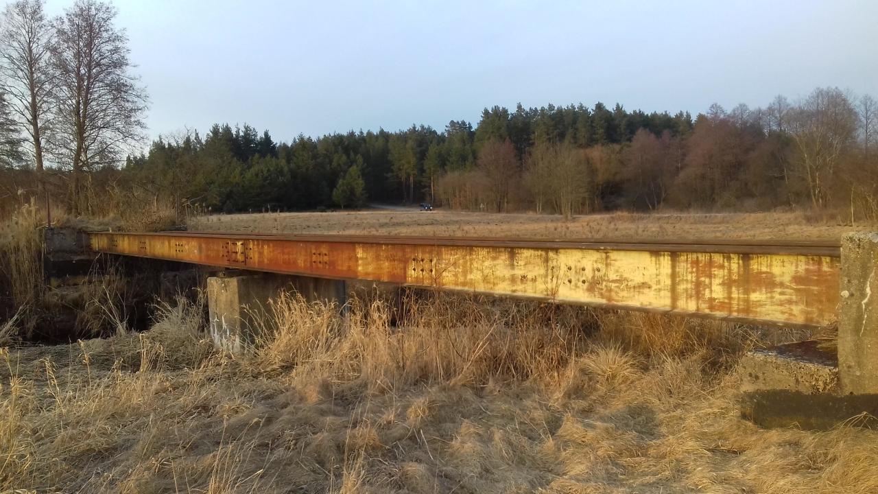 Km 7,8 rozmyty nasyp, linia nieprzejezdna. Prawdopodobnie bobry utworzyły rozlewisko, które stopniowo rozmywa nasyp. Według stanu na lipiec 2021, szyny wiszące w powietrzu, a podkłady rozsypane poniżej.