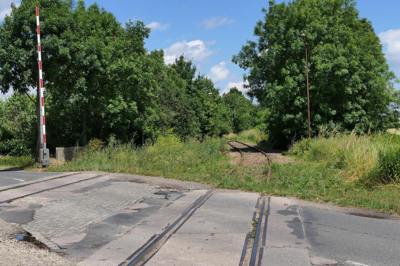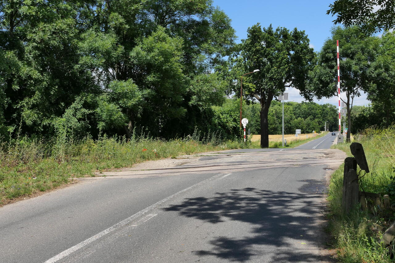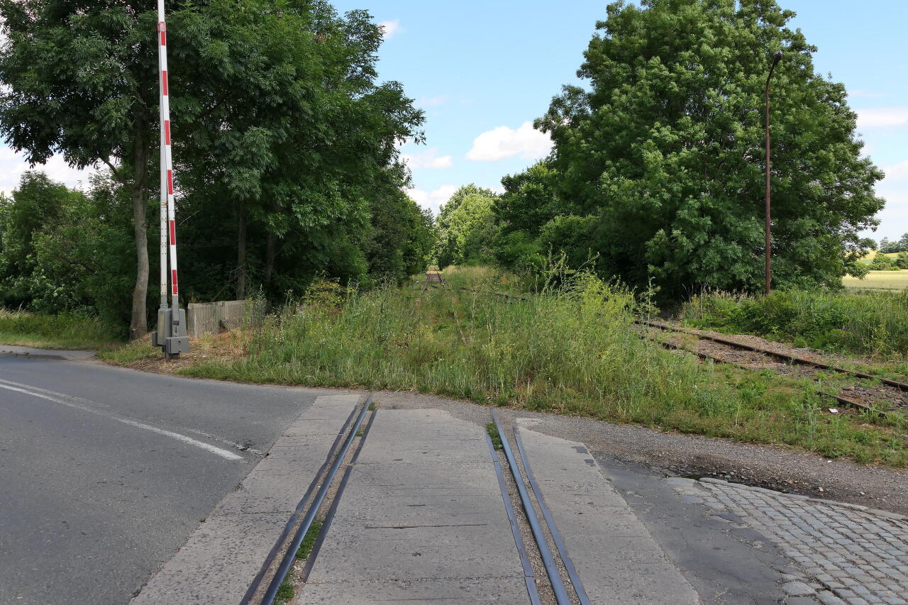 Przejazd kolejowy na wschód od ładowni kruszywa (za plecami). Widok w kierunku północno-wschodnim (posterunek odgałęźny Mietków/Wrocław).