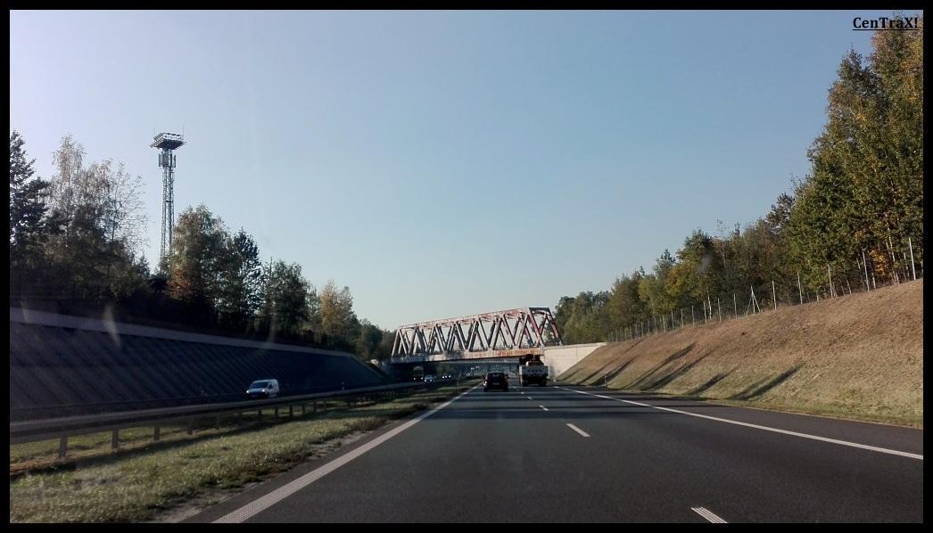 Wiadukty nad Autostradą A4 ~118 hm od JC. Za wiaduktami posterunek Poniatowski Pn. Lewy wiadukt nieczynny, tor rozebrany.