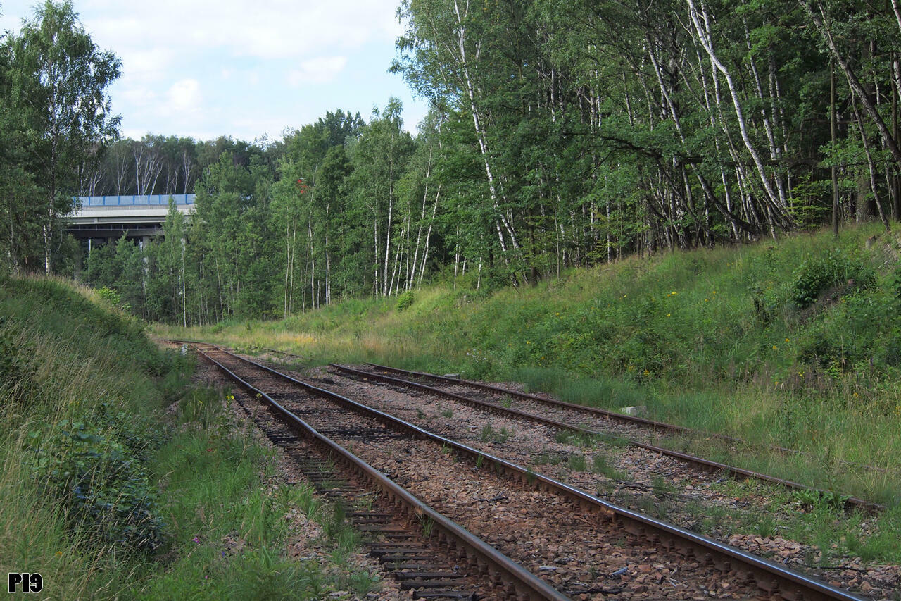 Widok z przejazdu kolejowego w lesie nieopodal p.o. Mysłowice Brzęczkowice (LK138). Widok w kierunku dawnego podg. Brzęczkowice, w oddali kawałek wiaduktu autostrady A4.