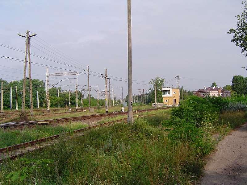 Legionowo. Na pierwszym planie zarośnięta bocznica i tor linii do Tłuszcza. W głębi nastawnia.