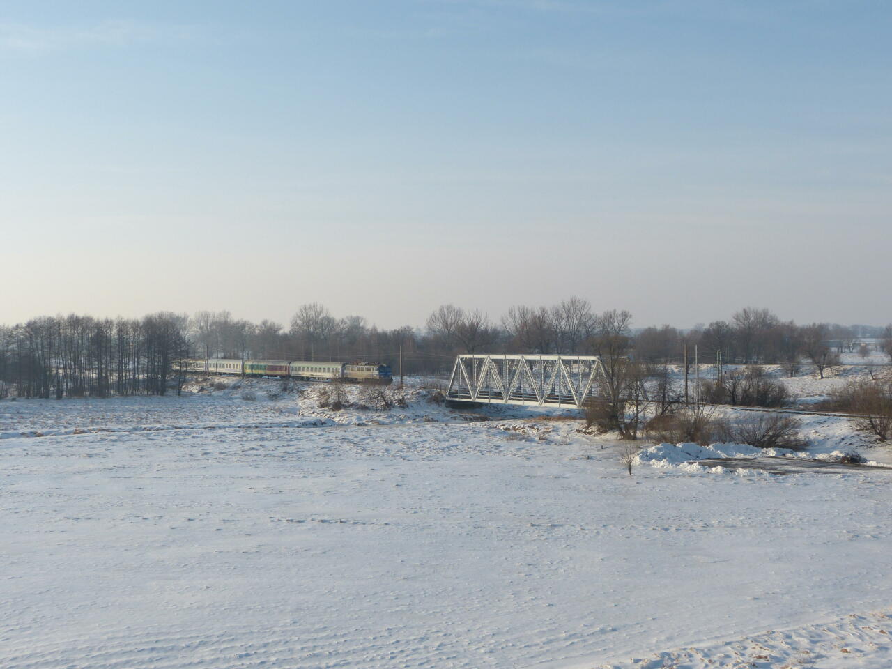 Most nad Rządzą w Starym Dybowie, skład kieruje się w stronę Tłuszcza.