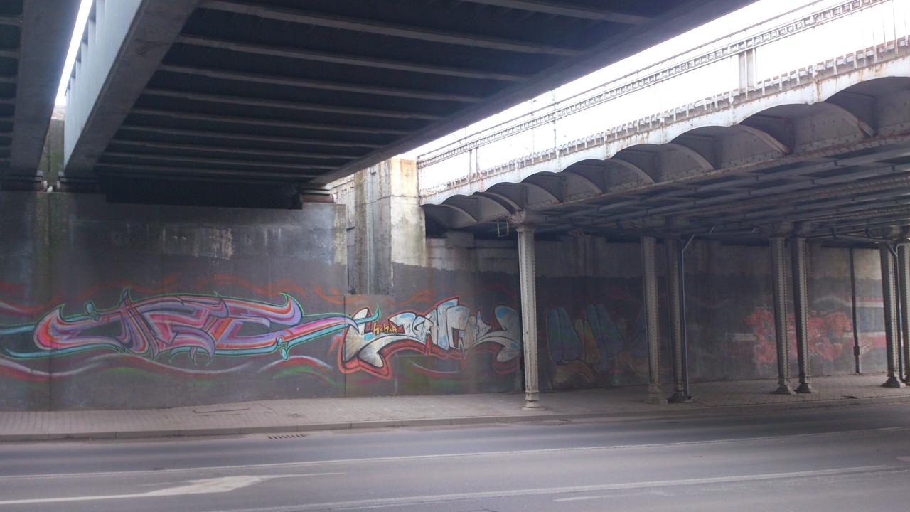 Niedokończony wiadukt w ciągu niedoszłej KRR; okolice skrzyżowania ulic Szczęść Boże i Torowej w Rudzie Śląskiej. Budowla jest obecnie miejscem spotkań okolicznej młodzieży i czymś w rodzaju afiszu informującego, kto aktualnie rządzi na Rudzie 1. Widok w kierunku zachodnim (Zabrze).