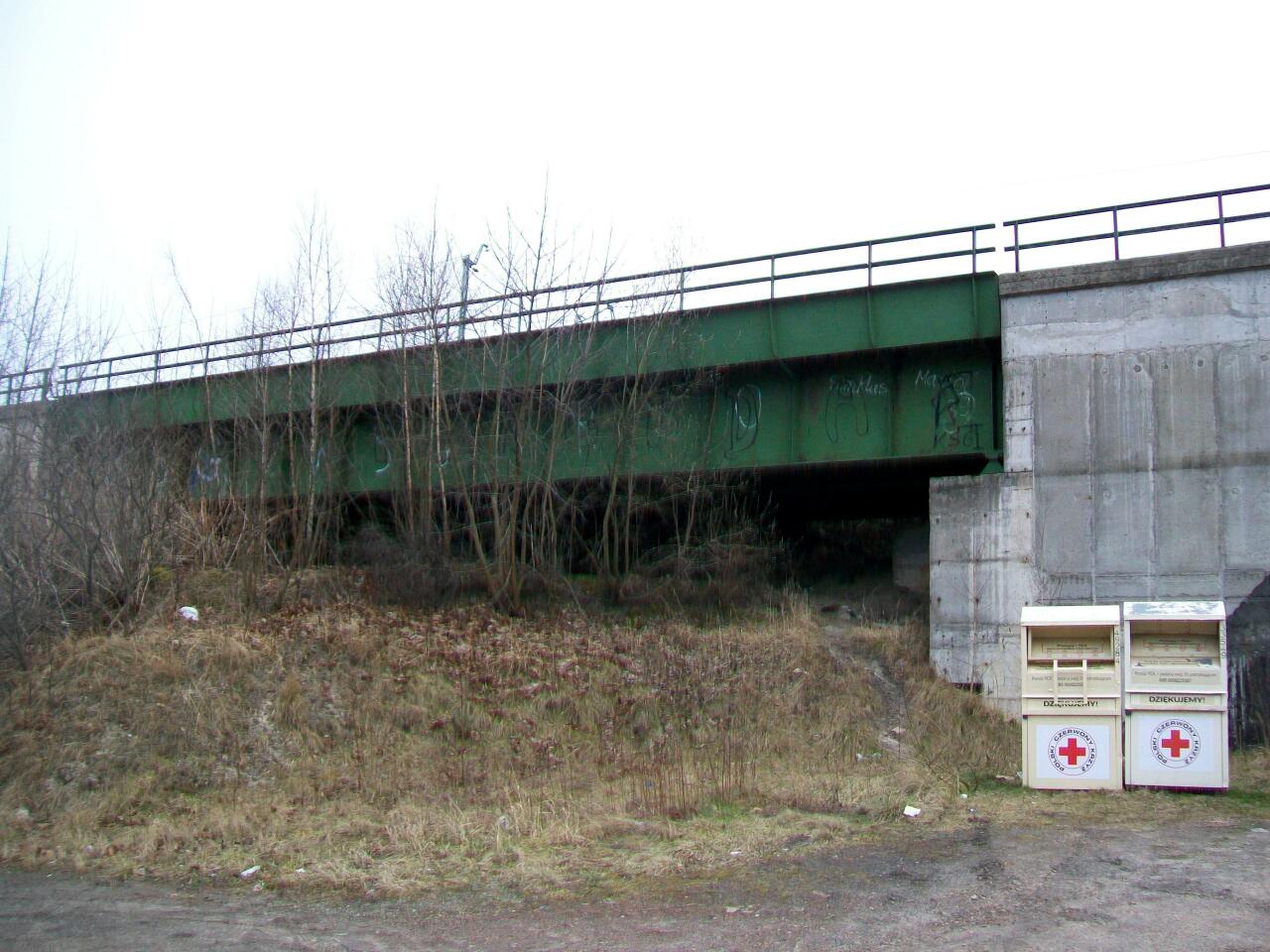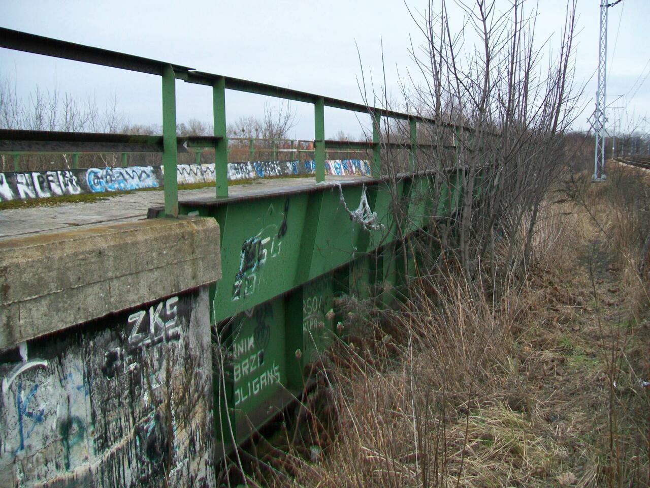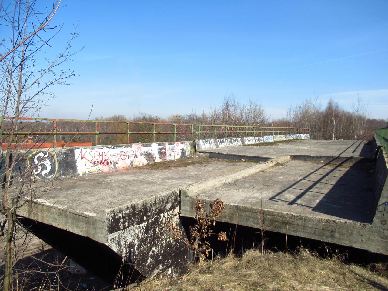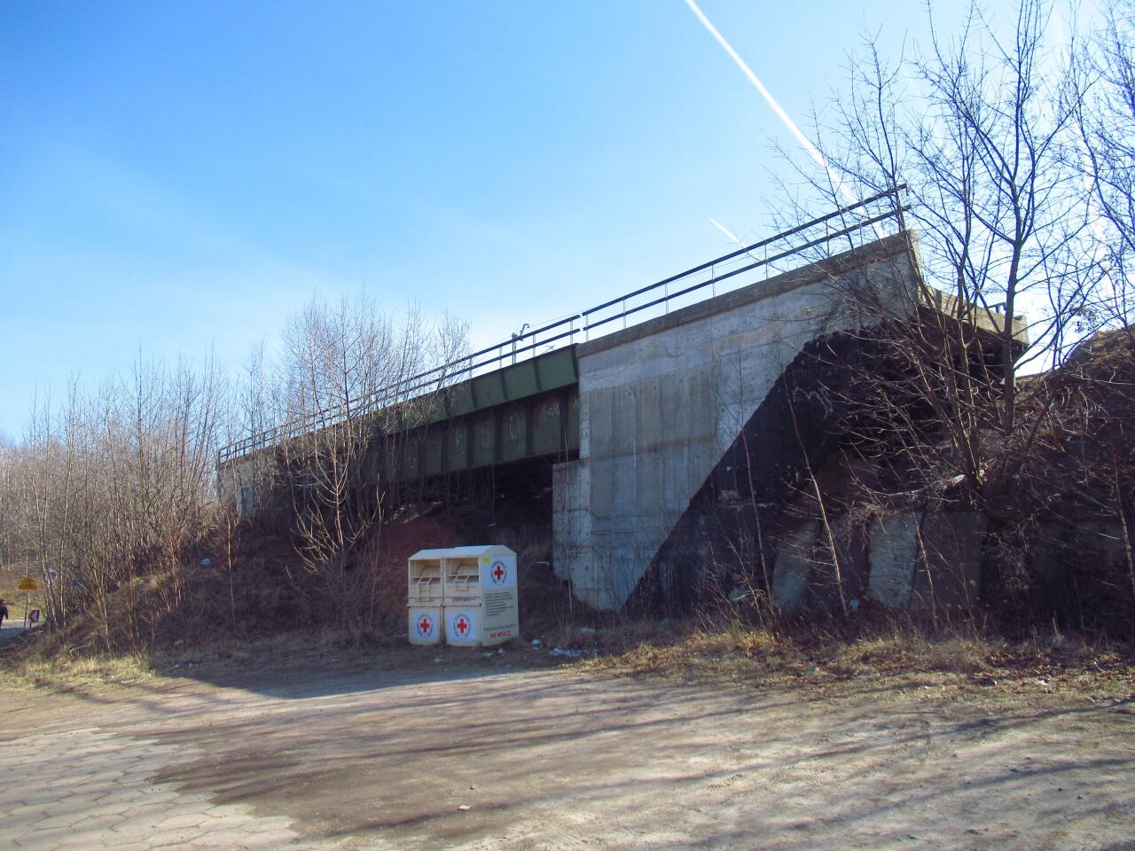 Nieczynny, nieukończony wiadukt kolejowy, mający nieść tory lk KP 301, w nowym śladzie. Środkowe przęsło, nad niedoszłą linią KRR. Widok w kierunku północno-zachodnim; w lewo i na wprost Pyskowice, w prawo Czechowice. W tle nasyp piaskówki w starym śladzie, kolidujący z przebiegiem KRR, który miał zostać zlikwidowany.