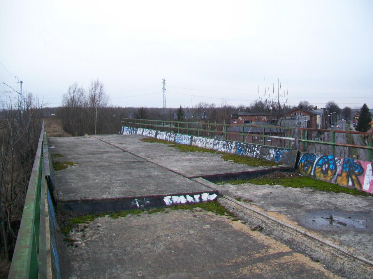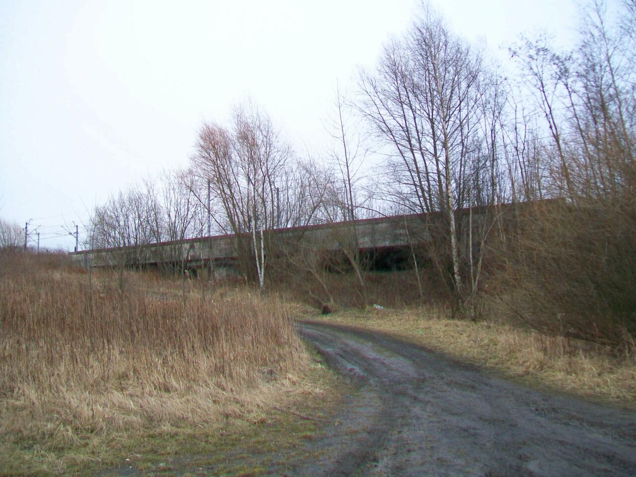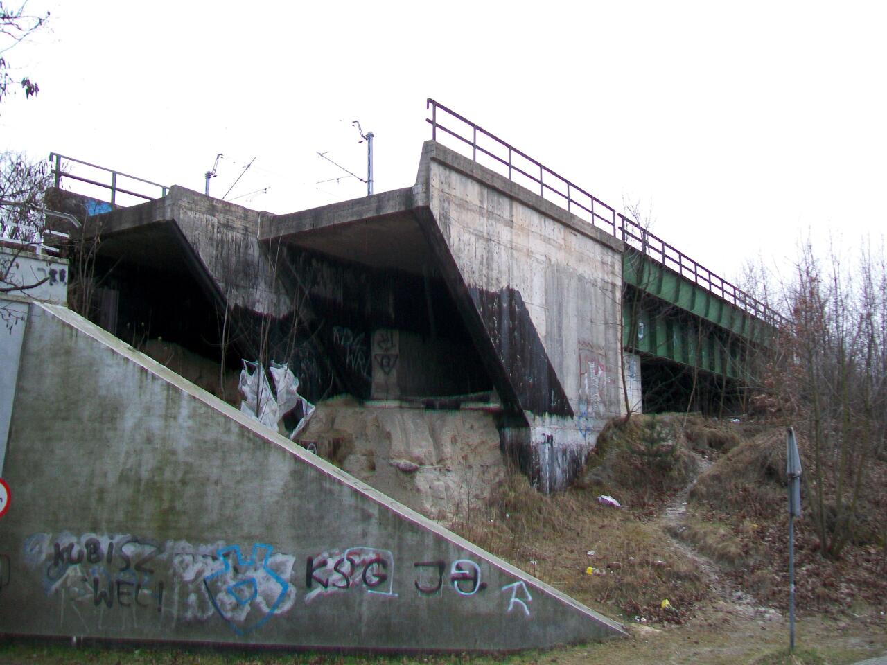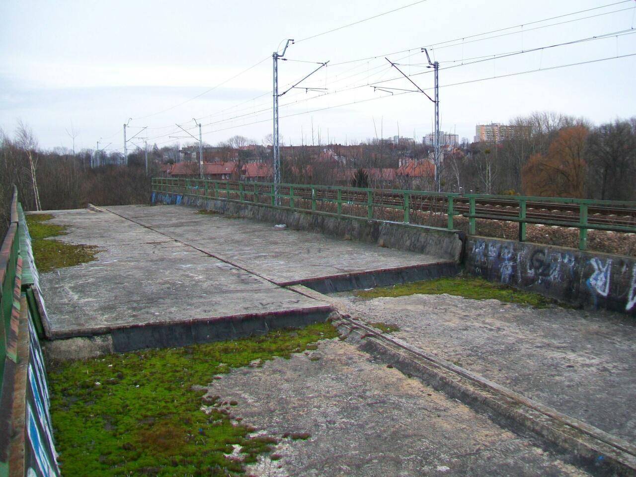 Nieczynny, nieukończony wiadukt kolejowy, mający nieść tory lk KP 301, w nowym śladzie. Środkowe przęsło, nad niedoszłą linią KRR. Widok w kierunku północno-zachodnim; w lewo i na wprost Pyskowice, w prawo Czechowice. W tle nasyp piaskówki w starym śladzie, kolidujący z przebiegiem KRR, który miał zostać zlikwidowany.
