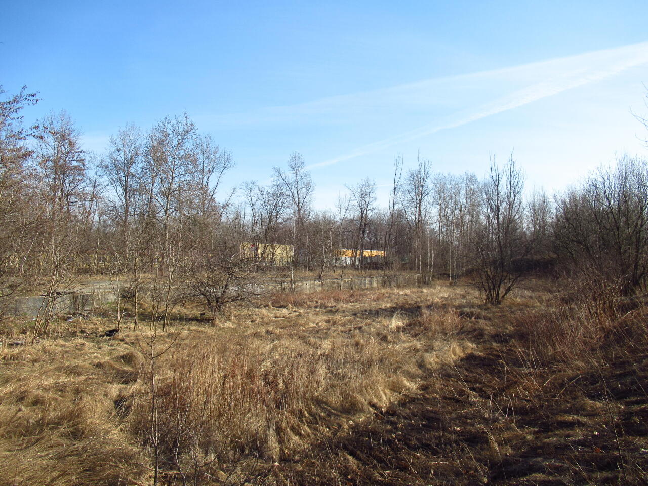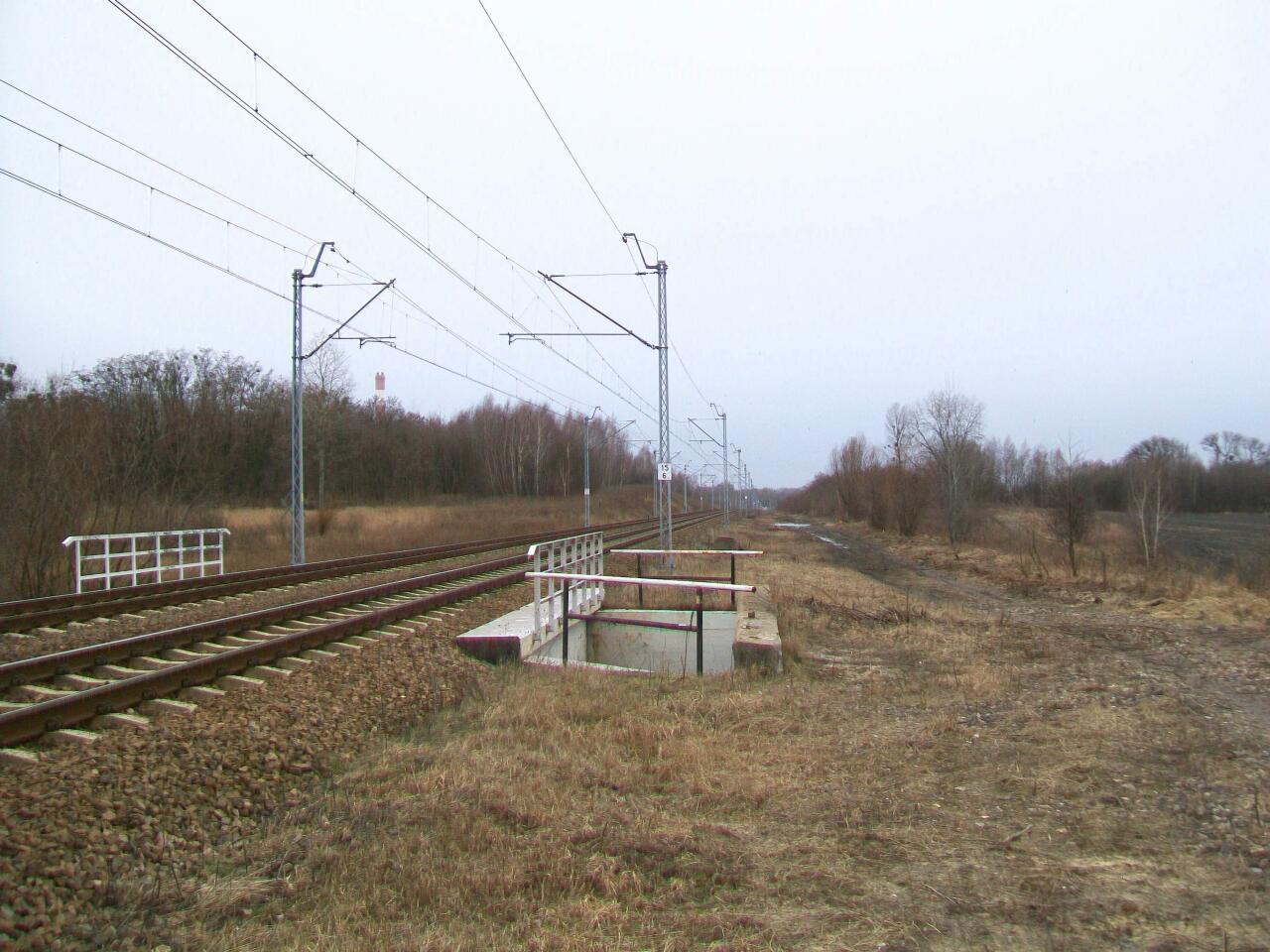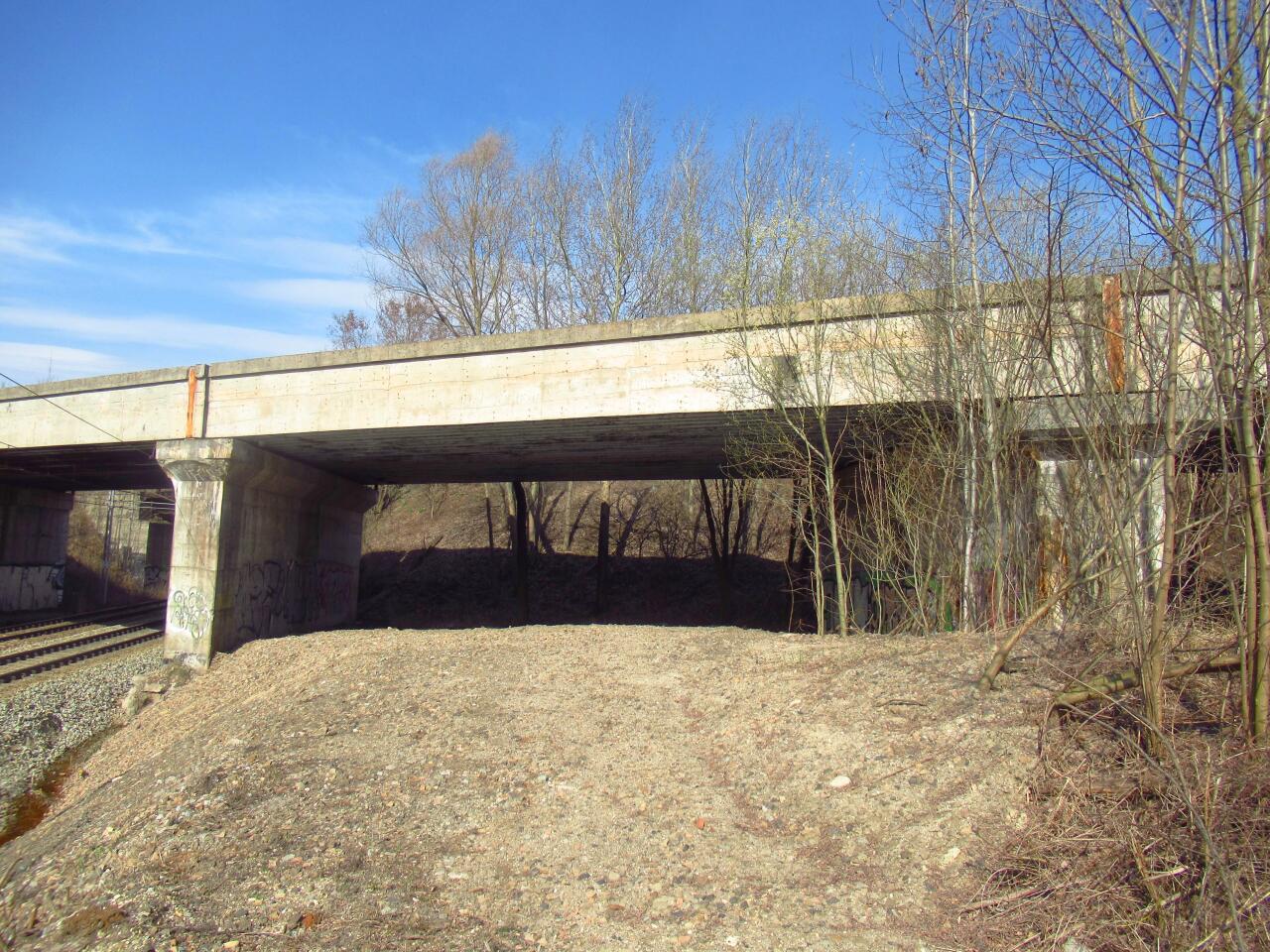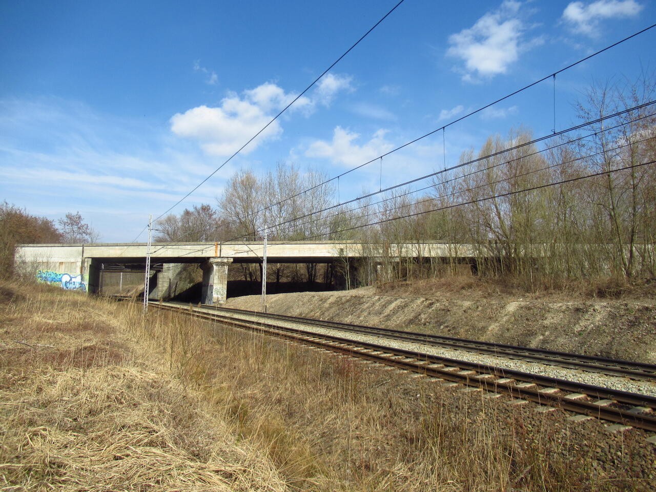 Nieczynny, nieukończony wiadukt kolejowy, mający nieść tory lk KP 301, w nowym śladzie. Środkowe przęsło, nad niedoszłą linią KRR. Widok w kierunku północno-zachodnim; w lewo i na wprost Pyskowice, w prawo Czechowice. W tle nasyp piaskówki w starym śladzie, kolidujący z przebiegiem KRR, który miał zostać zlikwidowany.