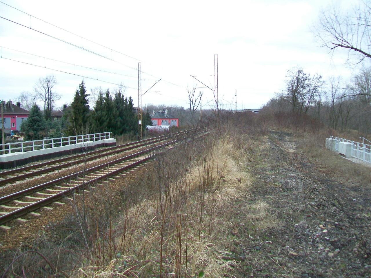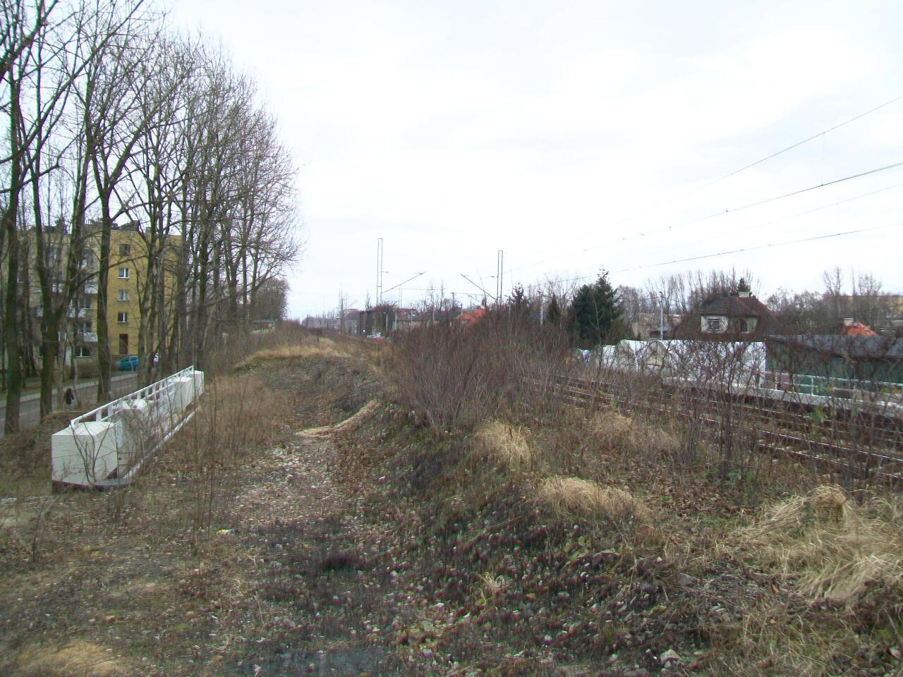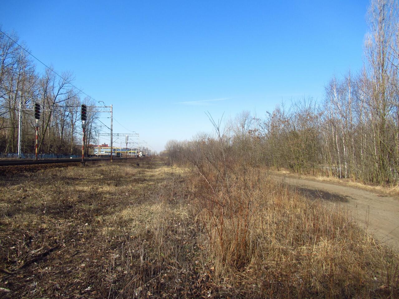 Z lewej wjazd do stacji Zabrze od strony Rudy Śląskiej. Na pierwszym plamie pas terenu, na którym miały być ułożone tory KRR. Widok w kierunku zachodnim (stacja Zabrze).