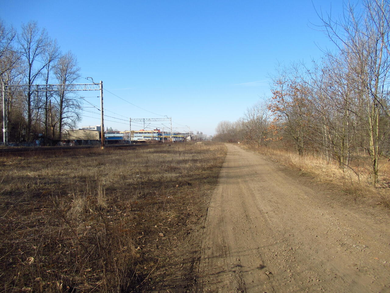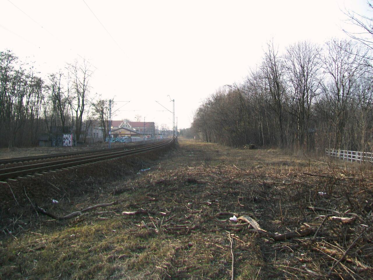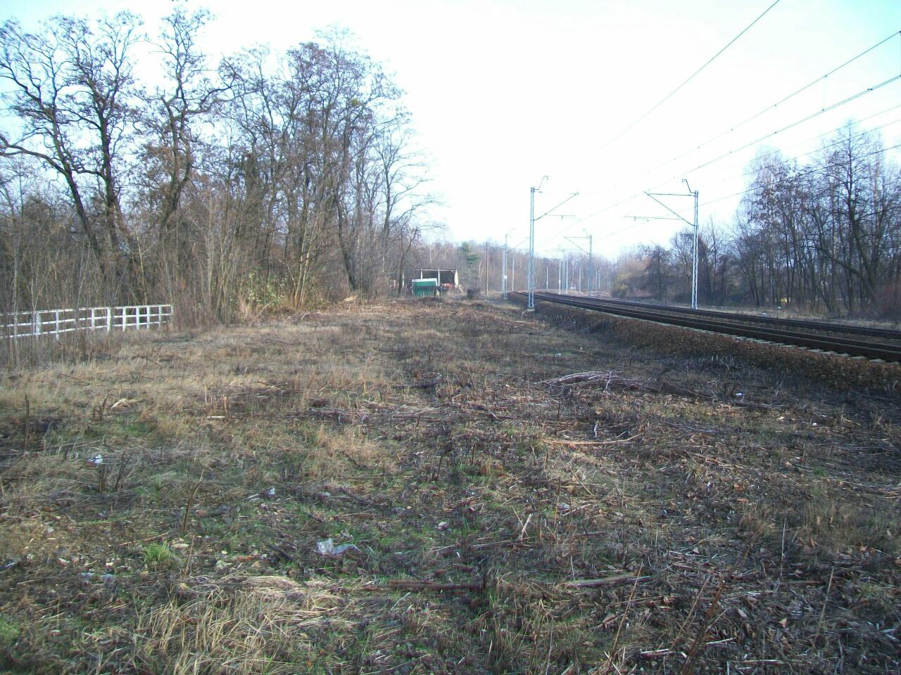 Z lewej wjazd do stacji Zabrze od strony Rudy Śląskiej. Na pierwszym plamie pas terenu, na którym miały być ułożone tory KRR. Widok w kierunku zachodnim (stacja Zabrze).