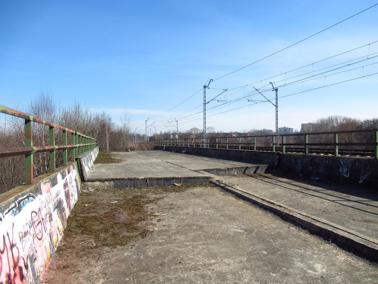 Wiadukt kolejowy nad ul. Władysława Sikorskiego w Świętochłowicach. W środku kadru pusty pas terenu po niedoszłej Kolei Ruchu Regionalnego. Widok w kierunku południowo-wschodnim; przystanek Świętochłowice/Chorzów Batory.