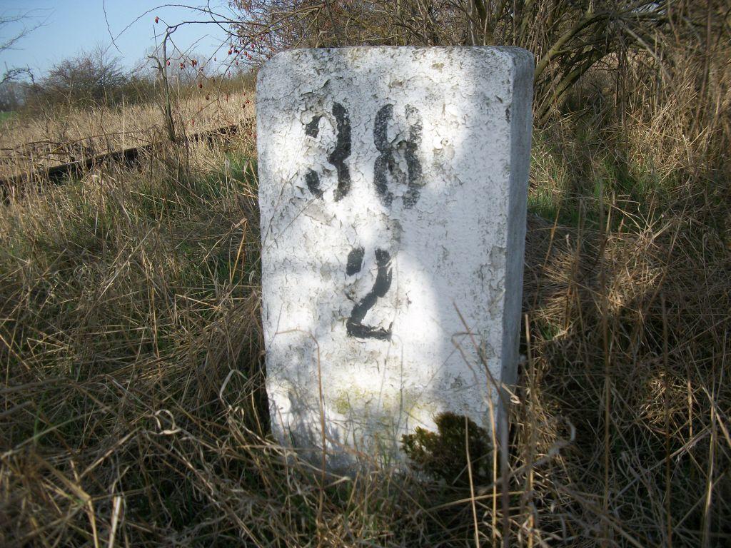 Słupek hektometryczny 38.2 przy wyjeździe ze stacji Głubczyce w kierunku Krnova.