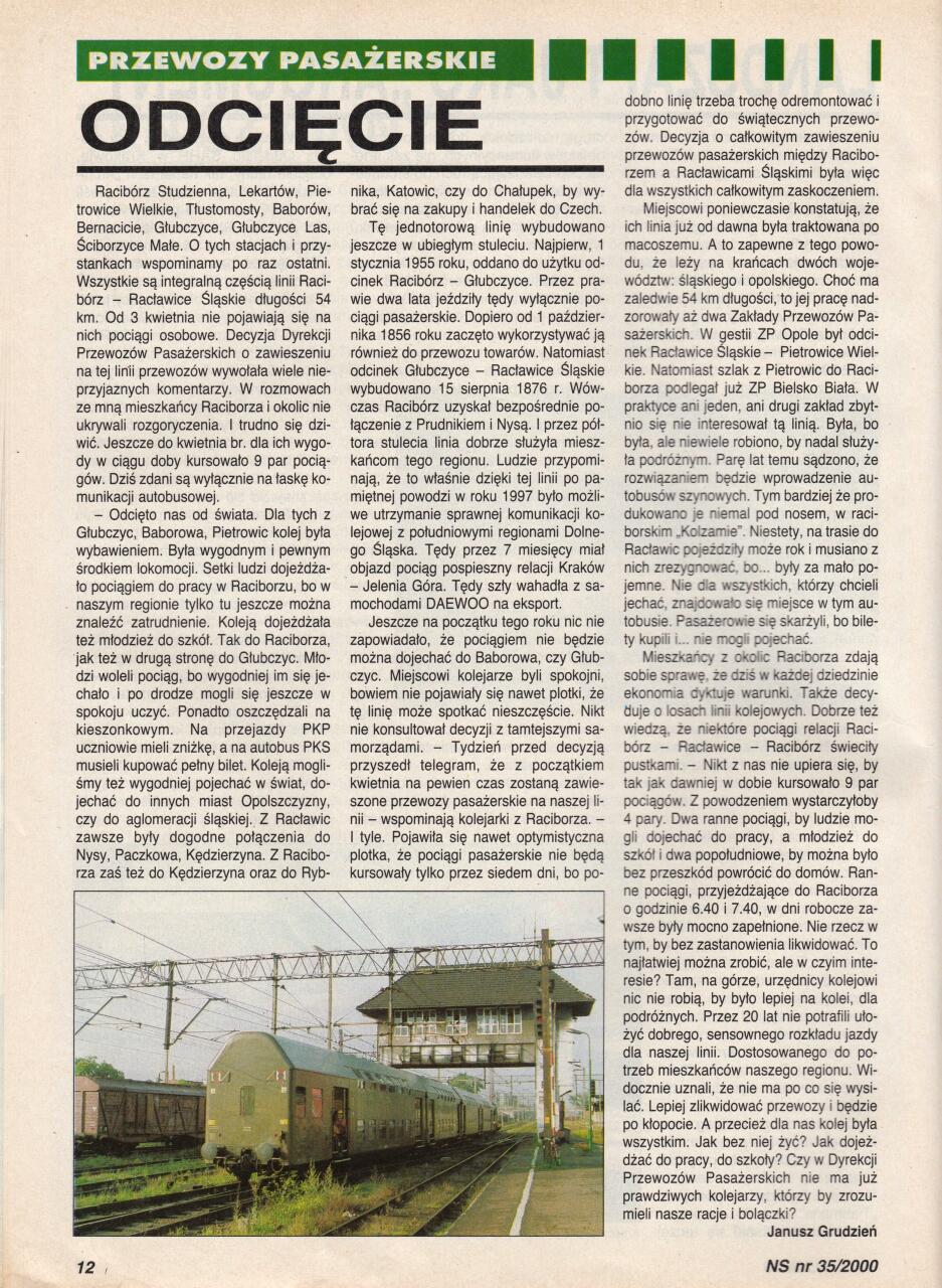 Skan artykułu z Nowych Sygnałów, dotyczący zawieszenia przewozów pasażerskich w relacji Racibórz - Racławice Śląskie; a mówiąc po ludzku: cynicznego i bezczelnego oszukania oraz pozostawienia na lodzie kilku tysięcy pasażerów, przez ówczesne władze PKP i rząd RP. Ówczesny minister transportu i gospodarki morskiej w rządzie Jerzego Buzka: Tadeusz Syryjczyk. Ówczesny dyrektor generalny PKP: Krzysztof Celiński.