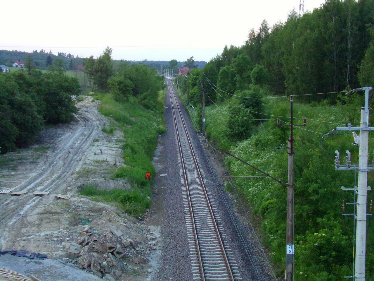 Widok w kierunku północnym (Olsztyn Główny) z wiaduktu (ok. 71,8 km) obwodnicy Olsztyna. W oddali widoczny peron przystanku Bartąg.