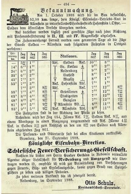 Pierwszy, historyczny rozkład jazdy pociągów osobowych dla linii Działdowo - Olsztyn, obowiązujący od 1.10.1888 r. Artykuł informujący o zakończeniu budowy odcinka Działdowo - Olsztynek i otwarciu nowego połączenia, wraz z tabelą rozkładu, ukazał się w gazecie niemieckojęzycznej pod koniec września 1888 r. Strona z artykułem została znaleziona kilka lat temu w Stawigudzie, na strychu remontowanego, poniemieckiego domu.