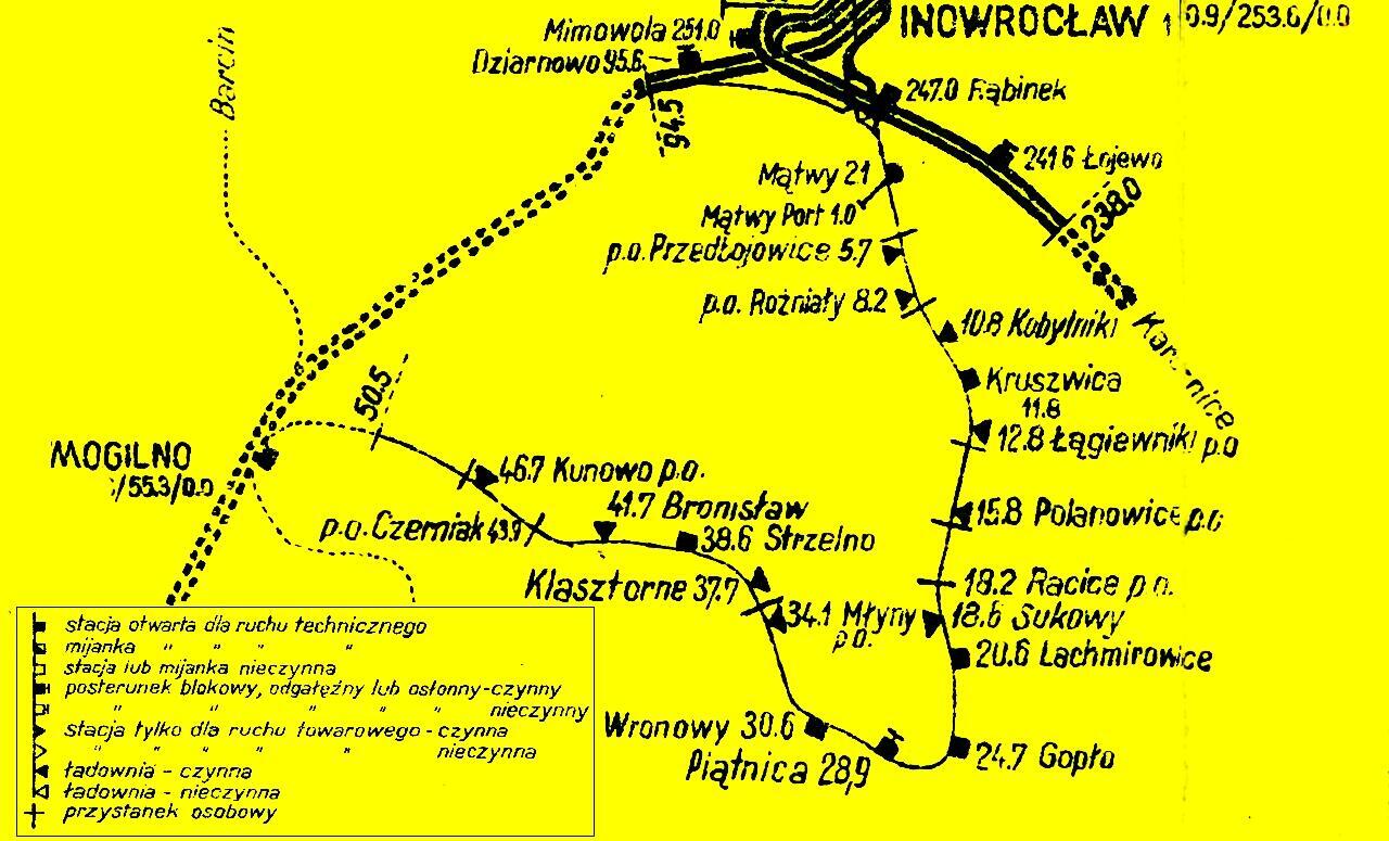 Dlaczego w opisie linii nie ma faktu że linia pierwotnie inaczej biegła ?! W pierwszych latach pociągi na Kruszwicę jechały z dworca głównego w Inowrocławiu przez obecny Park Solankowy i Osiedle Rąbin do Rąbinka . Mapy z lat 40 ukazują dokładnie tą linię