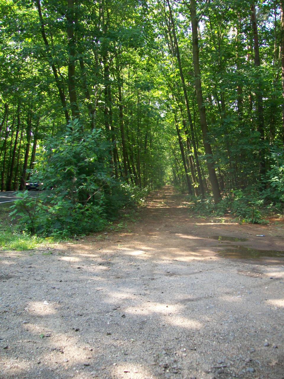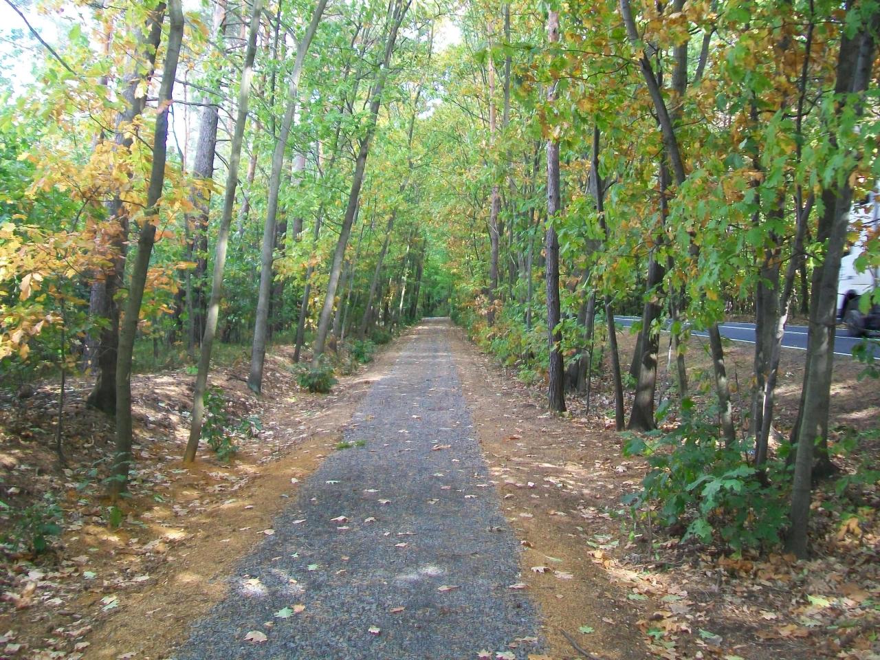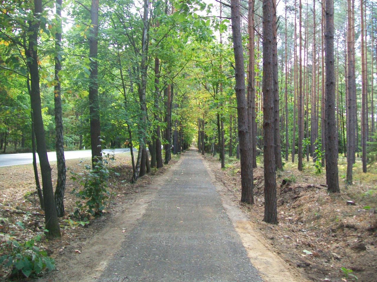 Ścieżka rowerowa na terenie starotorza przy Osiedlu Górniczym w Węglińcu, tuż przed przecięciem DW 296 i ładownią Zgorzelec Nadleśnictwo. Widok w kierunku północnym (stacja Węgliniec).
