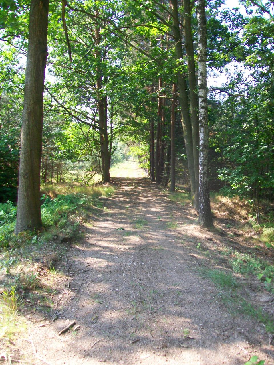 Tutaj tor kolejowy przecinał leśną drogą do części wsi Czerwona Woda zwaną Kacze Doły. Widok w kierunku południowo-zachodnim (Czerwona Woda).