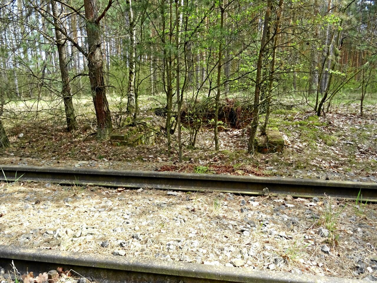 Kilometr około 93.75 - widok przez torowisko w kierunku fundamentów rozebranego budynku nastawni na terenie dawnej mijanki, zamkniętej tuż po II wojnie światowej.