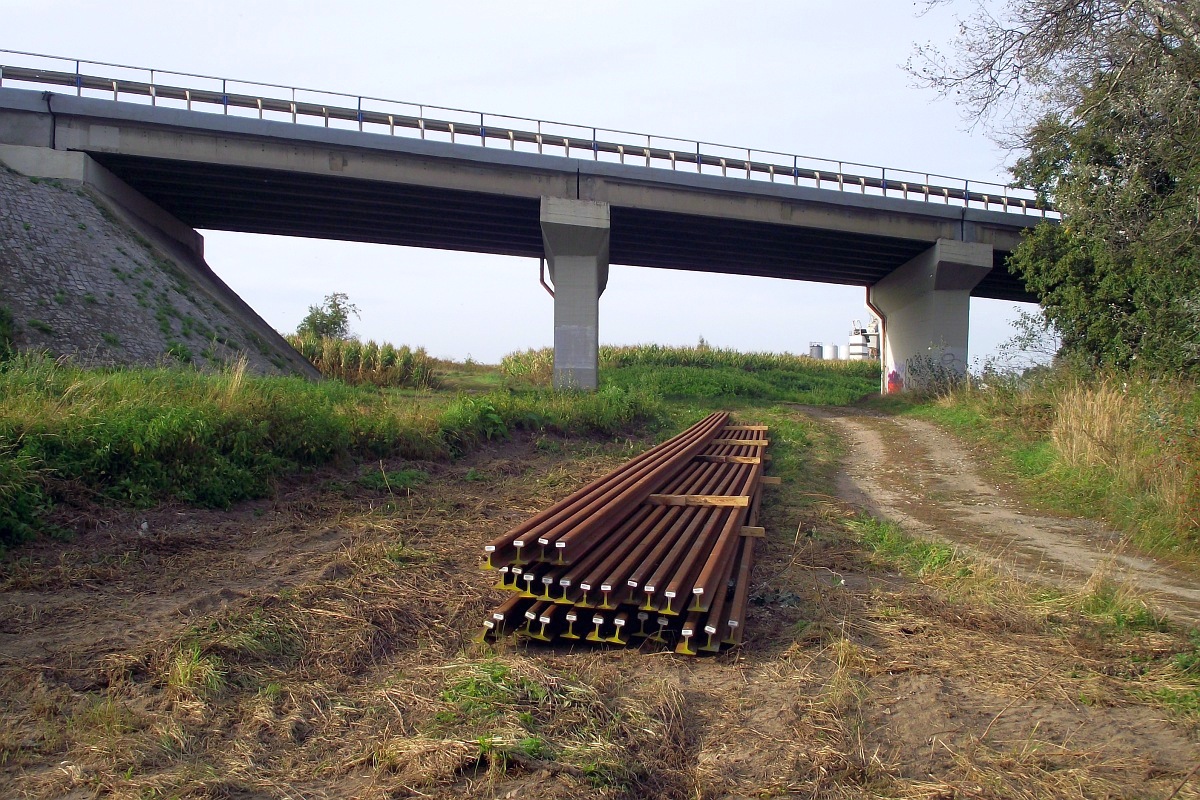 Szyny do odbudowy toru w północnej części Niemczy. Górą na wiadukcie przebiega droga krajowa nr 8.