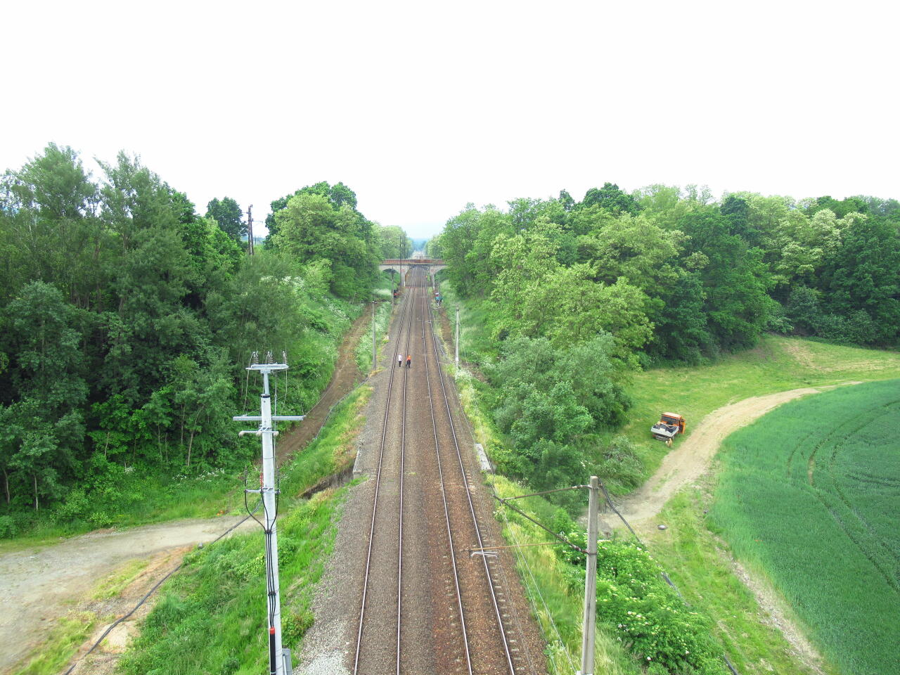 Widok z estakady w ciągu DK 33 nad torami lk 276 (z prawej, pod drutem) i 322 (z lewej, ze zdemontowanym drutem) w kierunku południowym (Stronie Śląskie, Bystrzyca Kłodzka). W kadrze wpierw wiadukt kolejowy, a następnie drogowy.