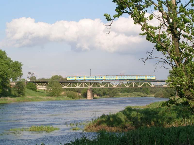 Blues Expres z Poznania do Zakrzewa przejeżdża przez most nad Wartą w Obornikach Wielkopolskich. Widok w kierunku Poznania.