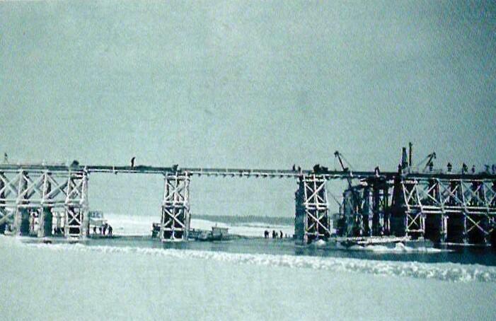 Zdjęcie przedstawiające budowę przeprawy przez rzekę Wartę w Obornikach.