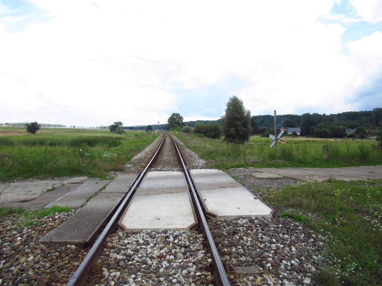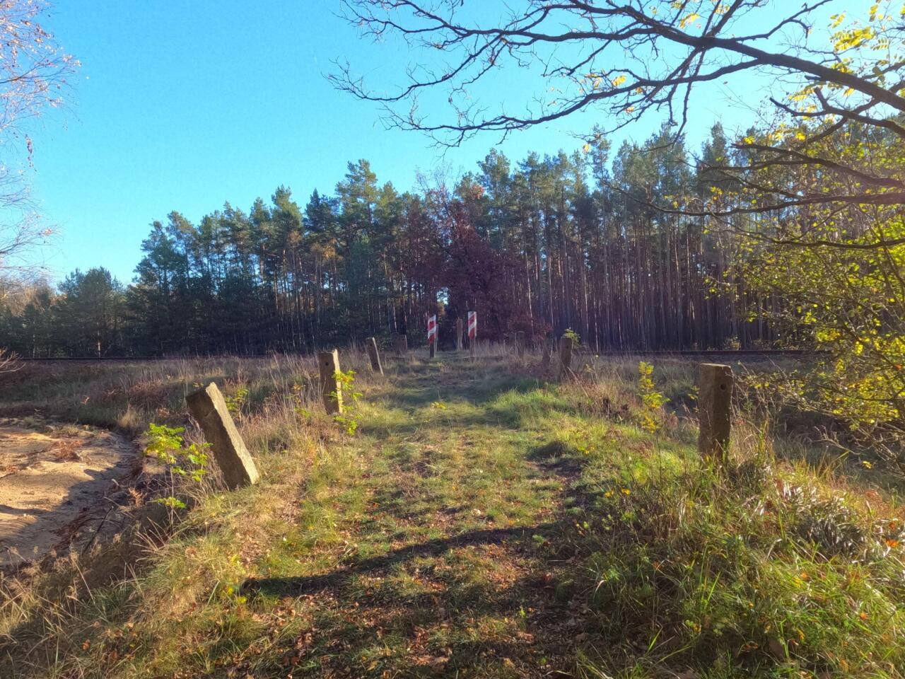 Przejazd kolejowy w Połupinie; km 64,5. Widok w kierunku wschodnim (Czerwieńsk). Z prawej zabudowa wsi, która mimo reaktywacji przewozów pasażerskich, znów zostanie pominięta w sieci przystanków, tak aby mieszkańcy mogli bezpiecznie skorzystać z pociągów do Zielonej Góry.