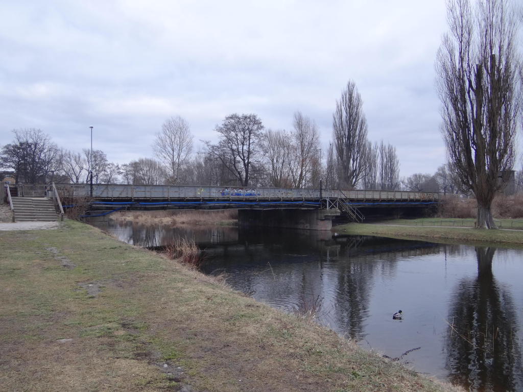 Most nad kanałem ulgi, na odcinku Gorzów Wielkopolski Zamoście (na wprost) - Gorzów Wielkopolski Zieleniec, w tle zabudowa na północnym brzegu Warty.