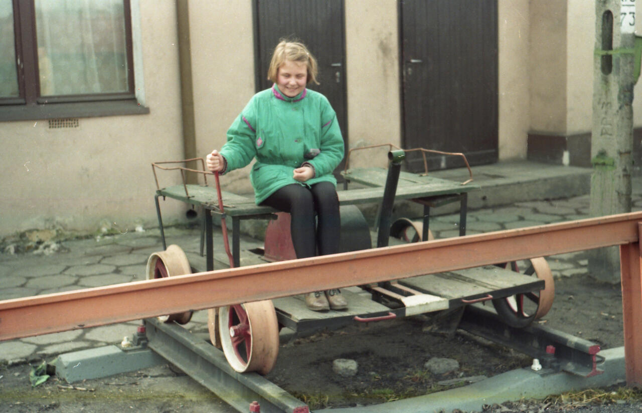 Stara drezyna eksponowana przed stołówką zakładową PKP, na towarowym dworcu w Międzyrzeczu.