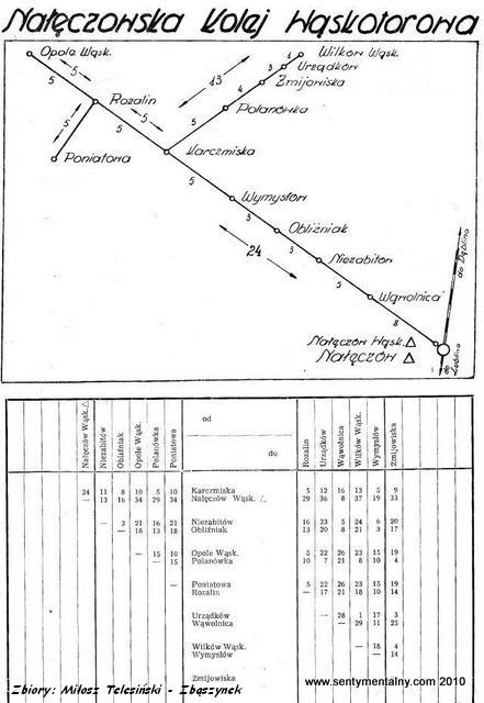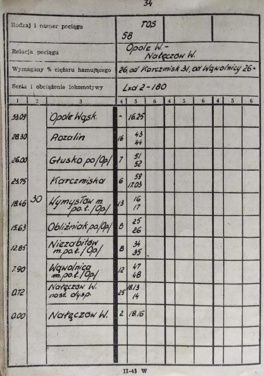 Pociąg pasażerski relacji Opole Wąskotorowe - Nałęczów Wąskotorowy, skan ze Służbowego Rozkładu Jazdy Pociągów Pasażerskich i Towarowych - zeszyt II-43W, strona 34 (RJ 1984/1985).