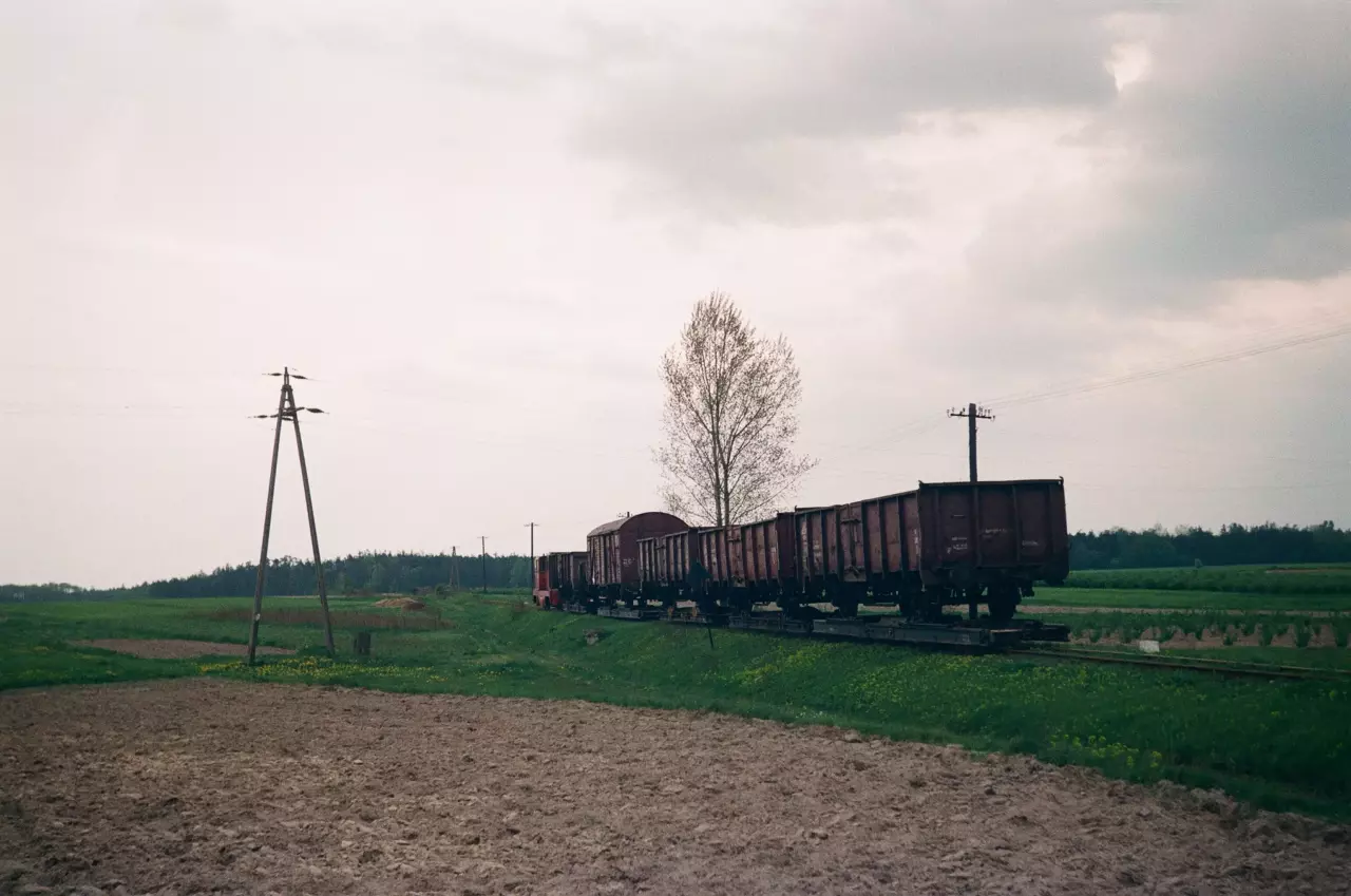 Odcinek Głusko - Leszczyniec, pociąg towarowy transporterowy relacji Nałęczów Wąskotorowy - Opole Wąskotorowe, prowadzony lokomotywą Lxd2-300, widok w kierunku stacji Opole Wąskotorowe.