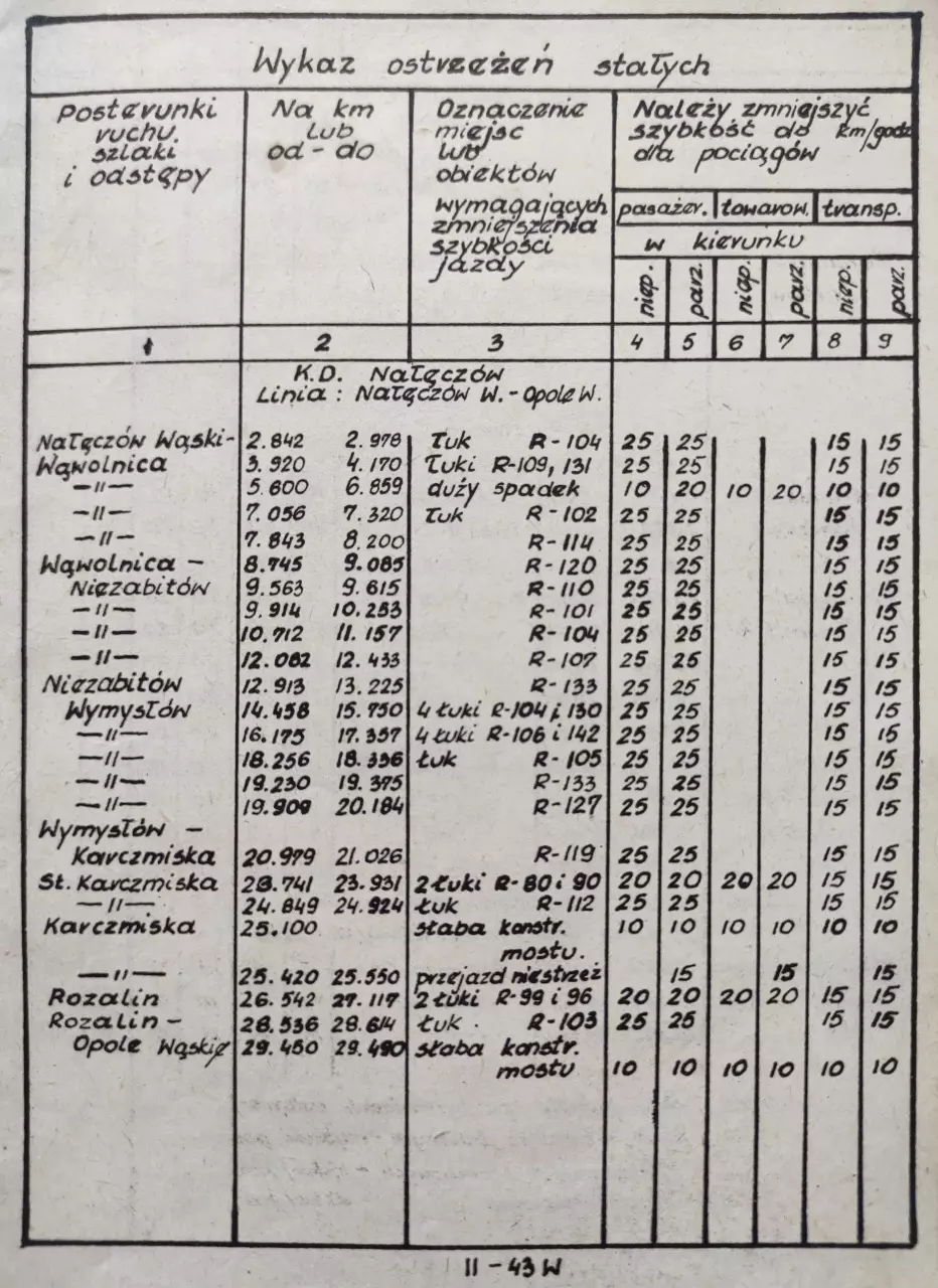 Wykaz ostrzeżeń stałych: odcinek Nałęczów Wąskotorowy - km 29,490 linii Nałęczów Wąskotorowy - Opole Wąskotorowe, skan ze Służbowego Rozkładu Jazdy Pociągów Pasażerskich i Towarowych - zeszyt II-43W (RJ 1984/1985).